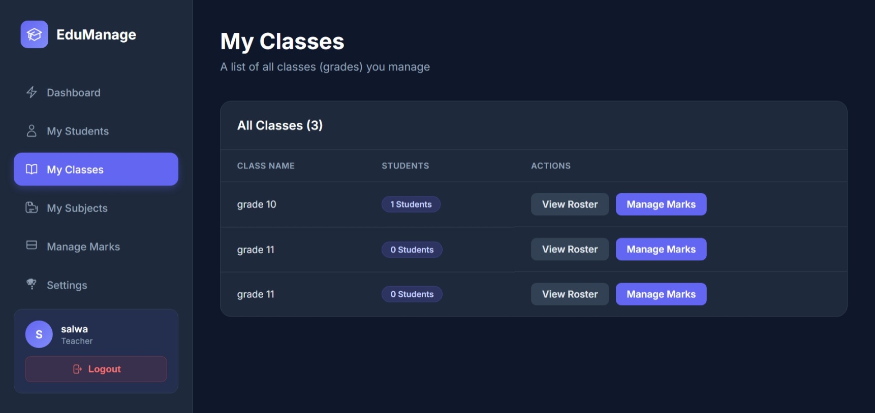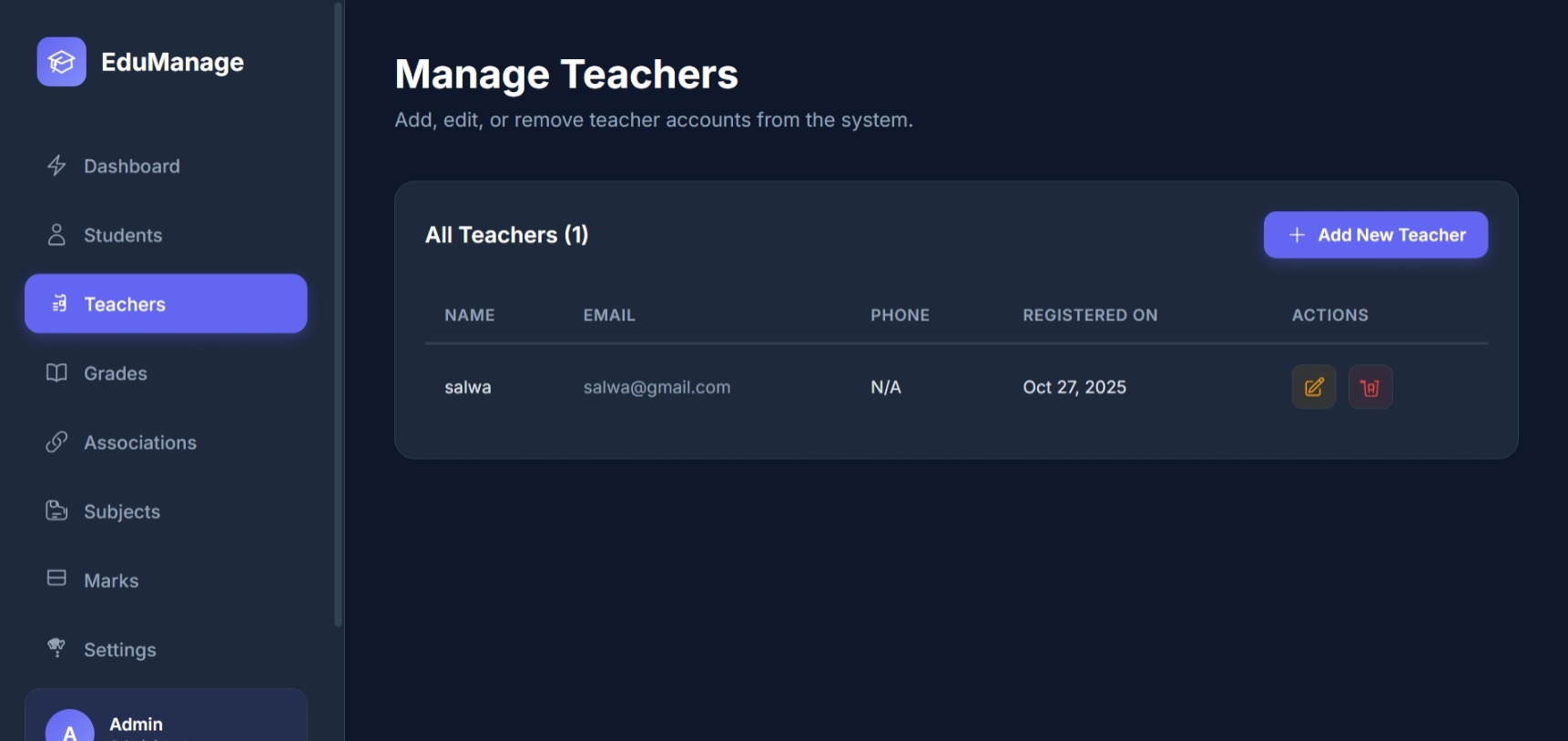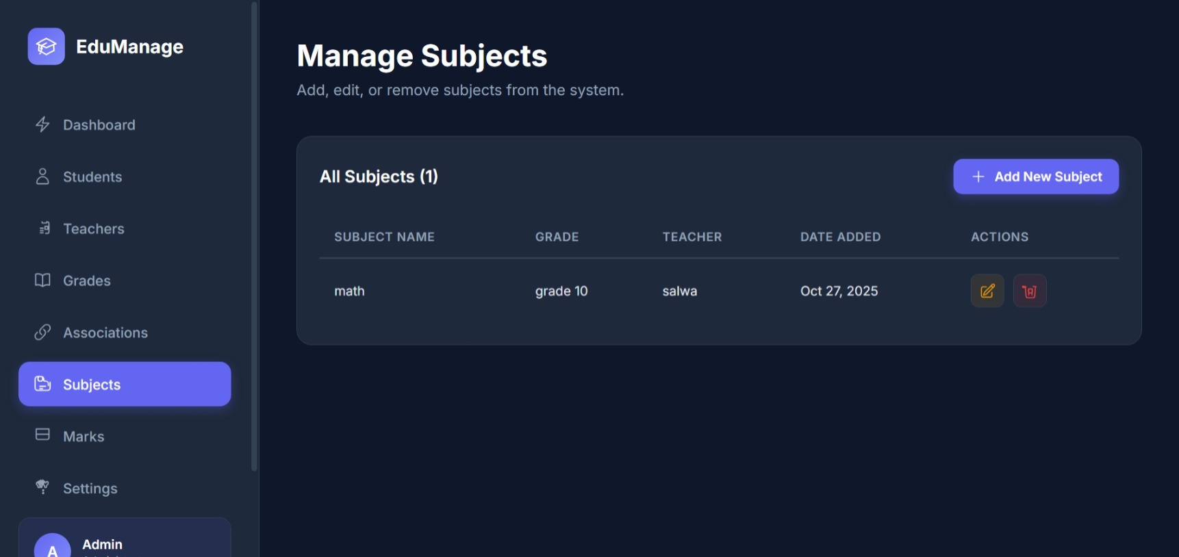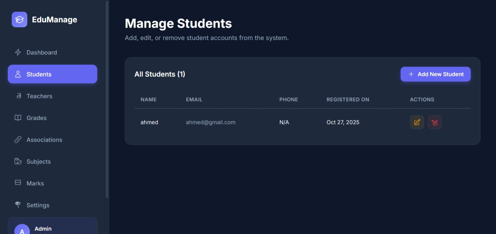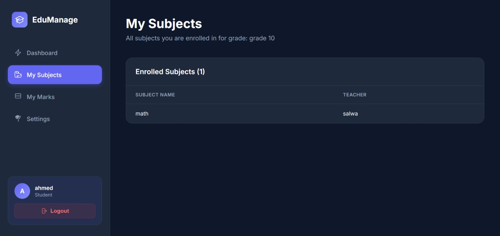 A School Management Web Application that connects administrators, teachers, and students on one platform. It manages student enrollment, class associations, subjects, and grading. Administrators have full control over the system, teachers can add and manage student marks, and students can only view their grades, subjects, and class details — providing a centralized and efficient digital school environment.
