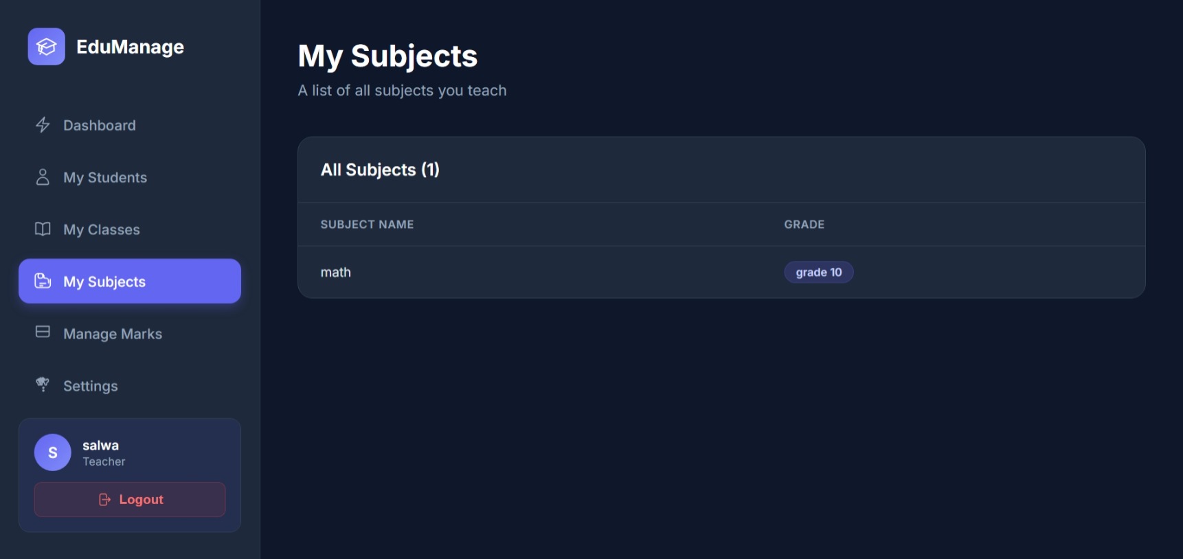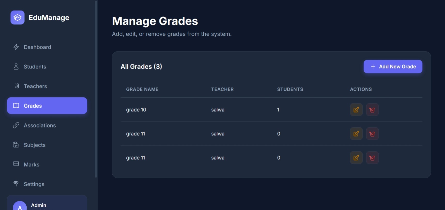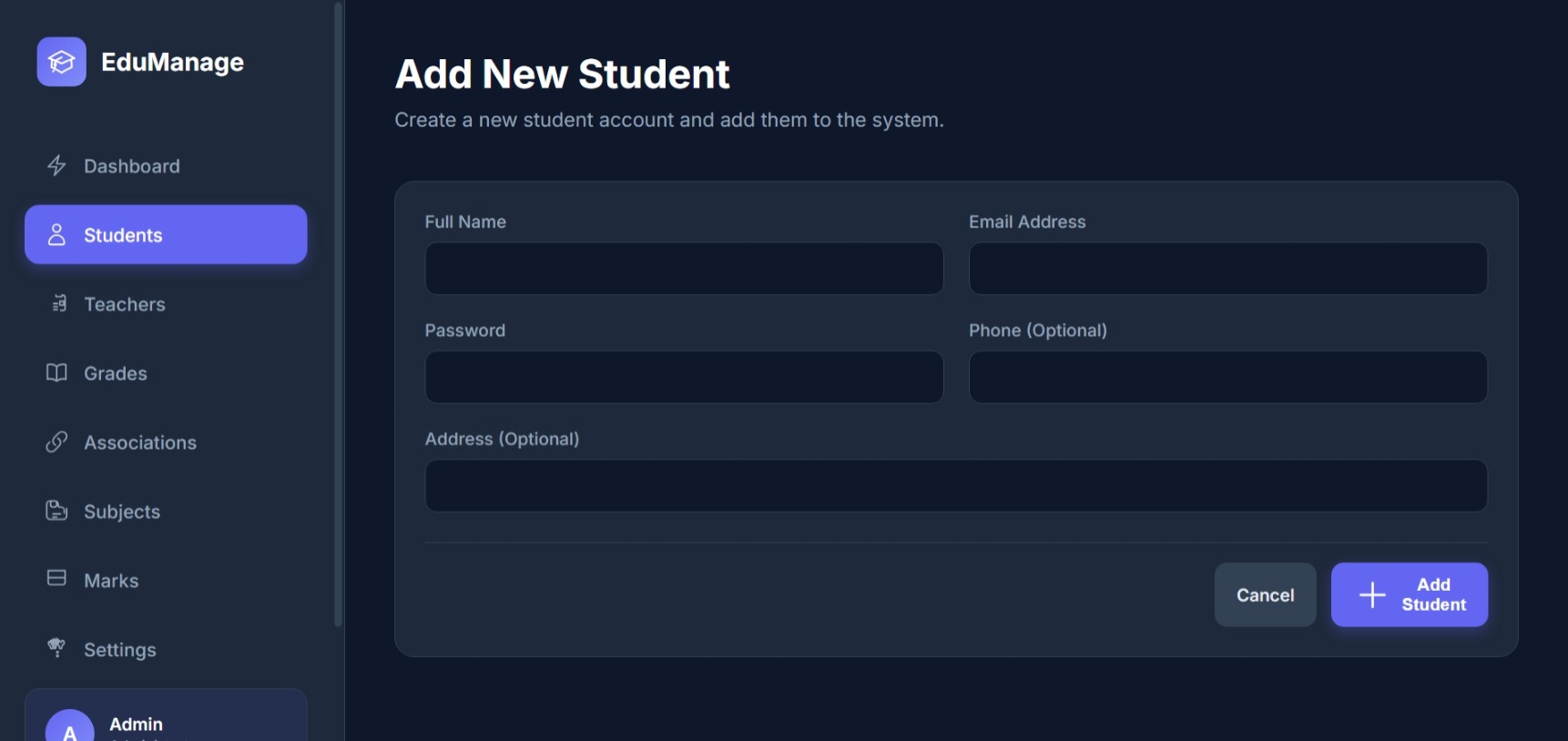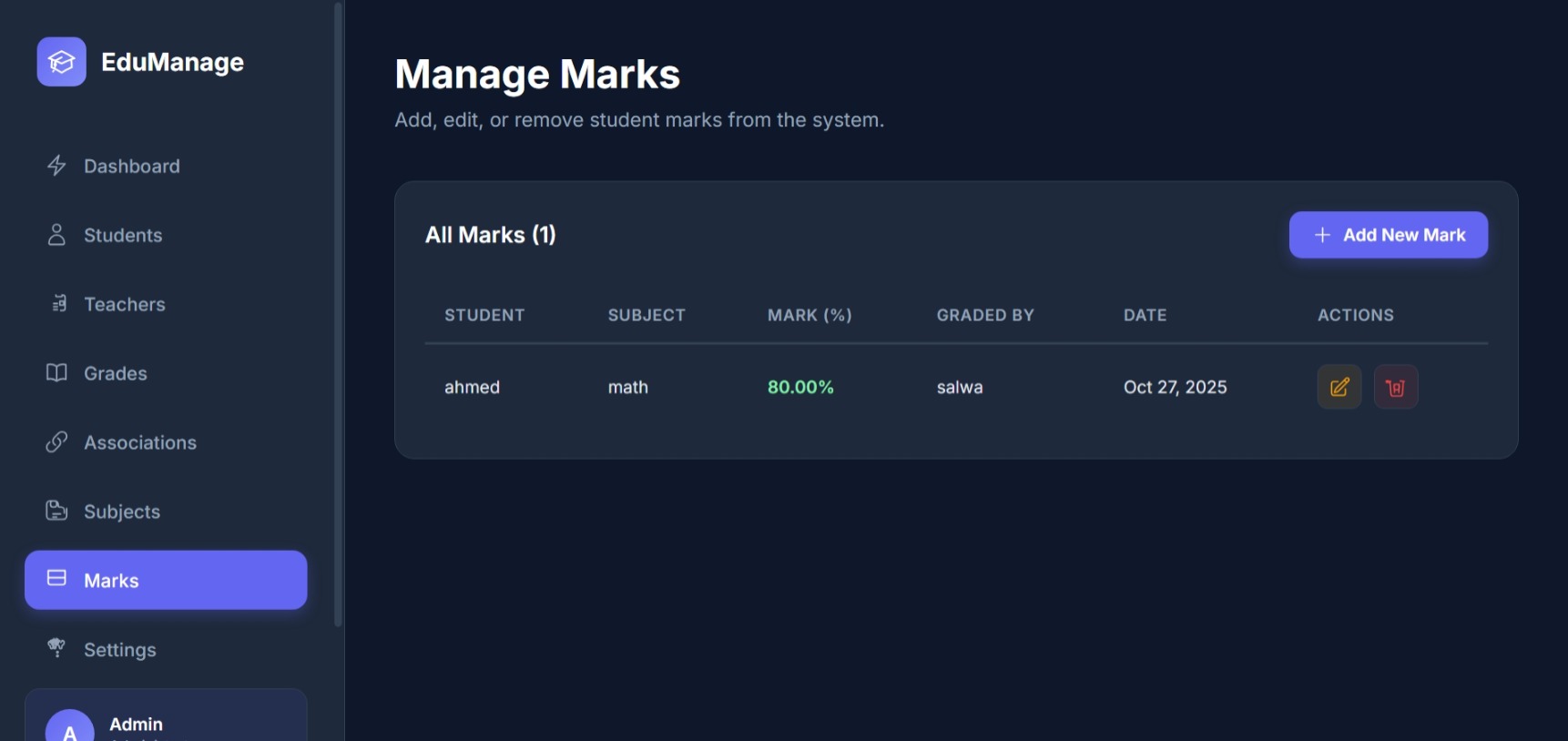 A School Management Web Application that connects administrators, teachers, and students on one platform. It manages student enrollment, class associations, subjects, and grading. Administrators have full control over the system, teachers can add and manage student marks, and students can only view their grades, subjects, and class details — providing a centralized and efficient digital school environment.