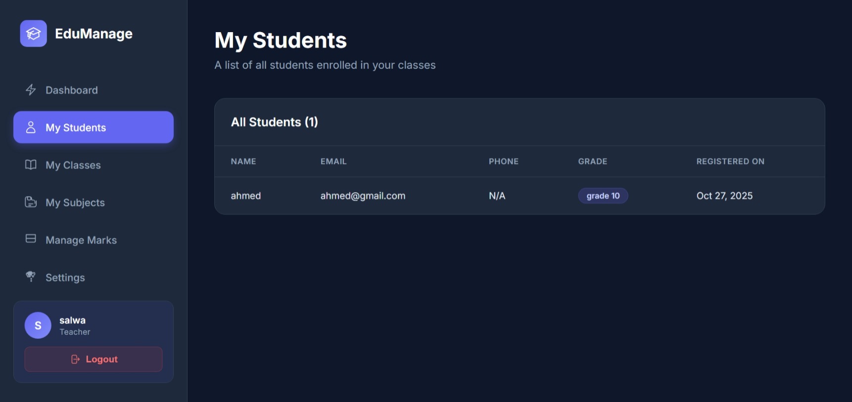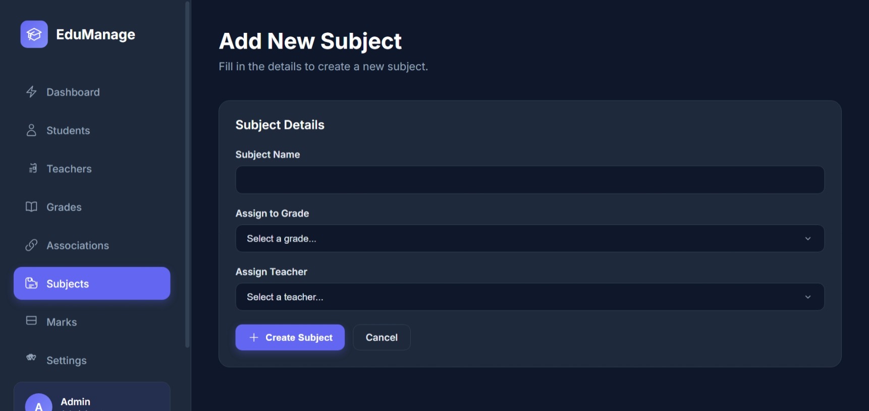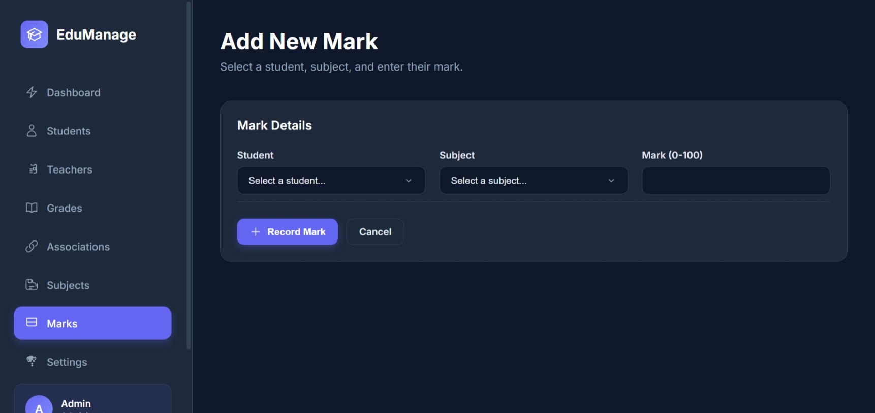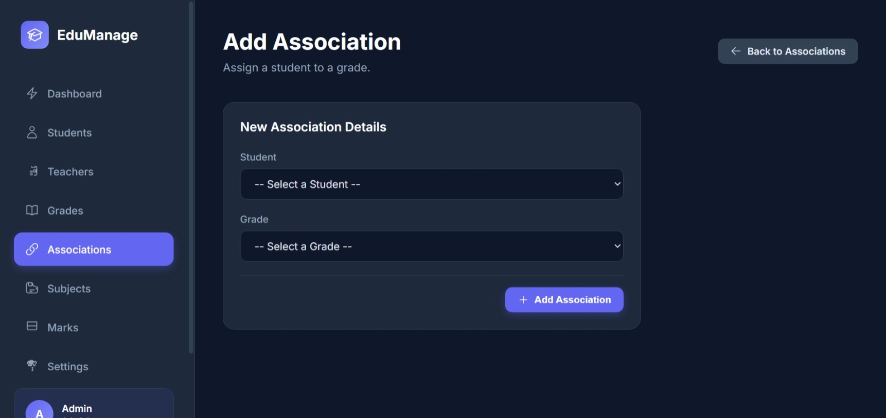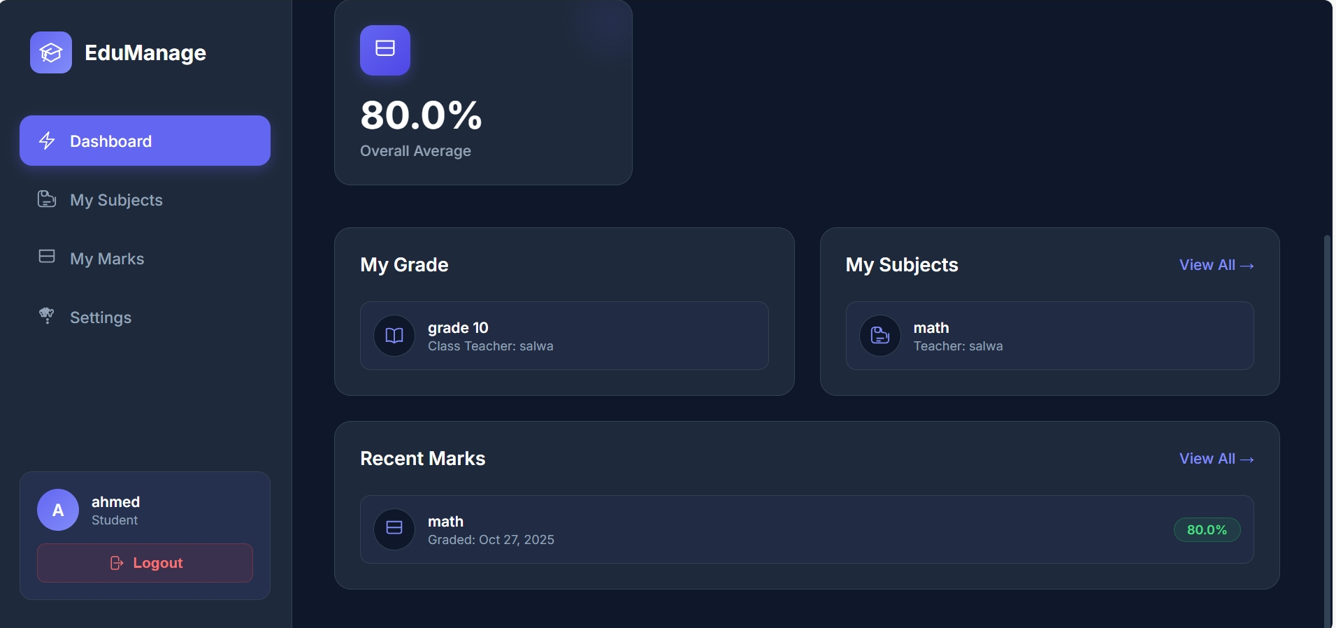 A School Management Web Application that connects administrators, teachers, and students on one platform. It manages student enrollment, class associations, subjects, and grading. Administrators have full control over the system, teachers can add and manage student marks, and students can only view their grades, subjects, and class details — providing a centralized and efficient digital school environment.