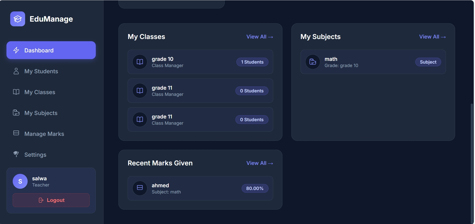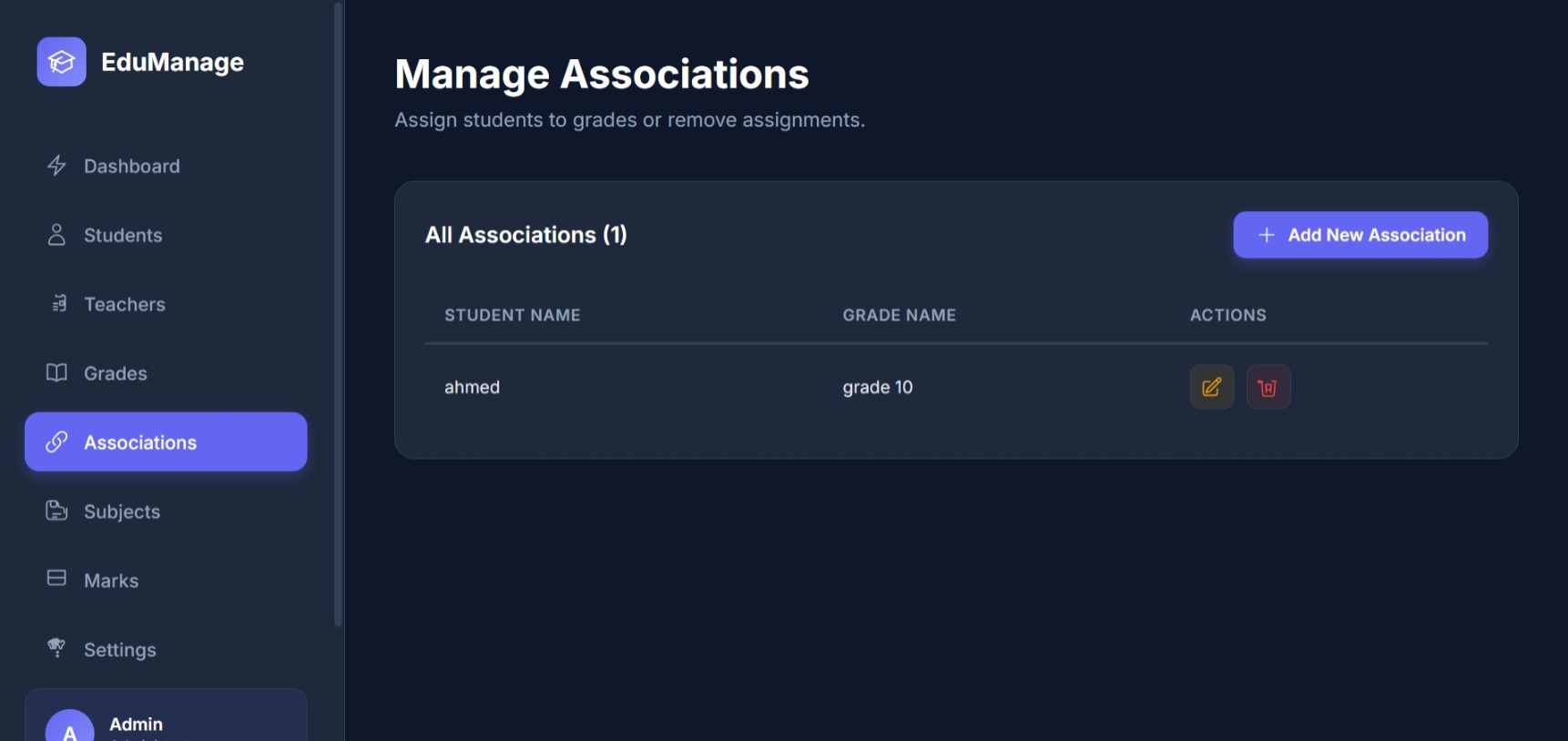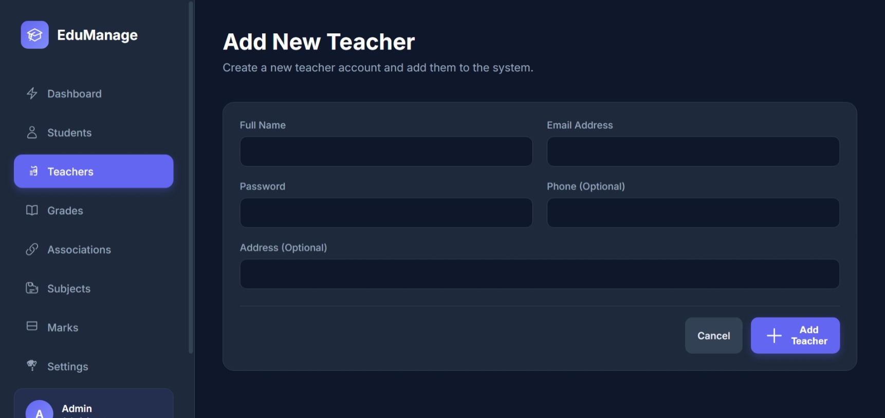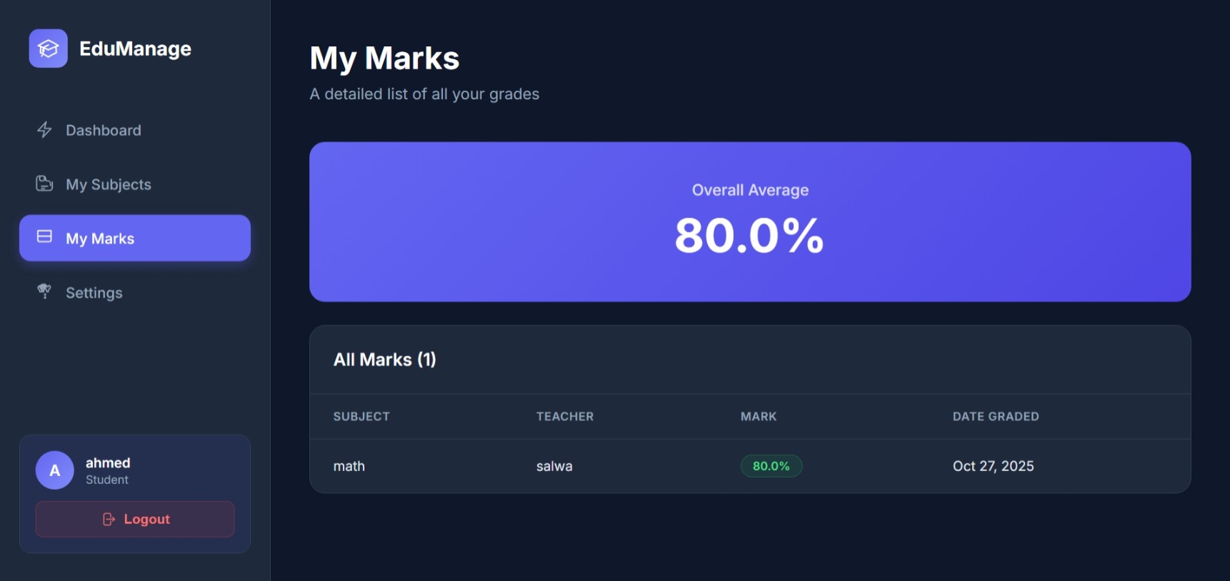 A School Management Web Application that connects administrators, teachers, and students on one platform. It manages student enrollment, class associations, subjects, and grading. Administrators have full control over the system, teachers can add and manage student marks, and students can only view their grades, subjects, and class details — providing a centralized and efficient digital school environment.