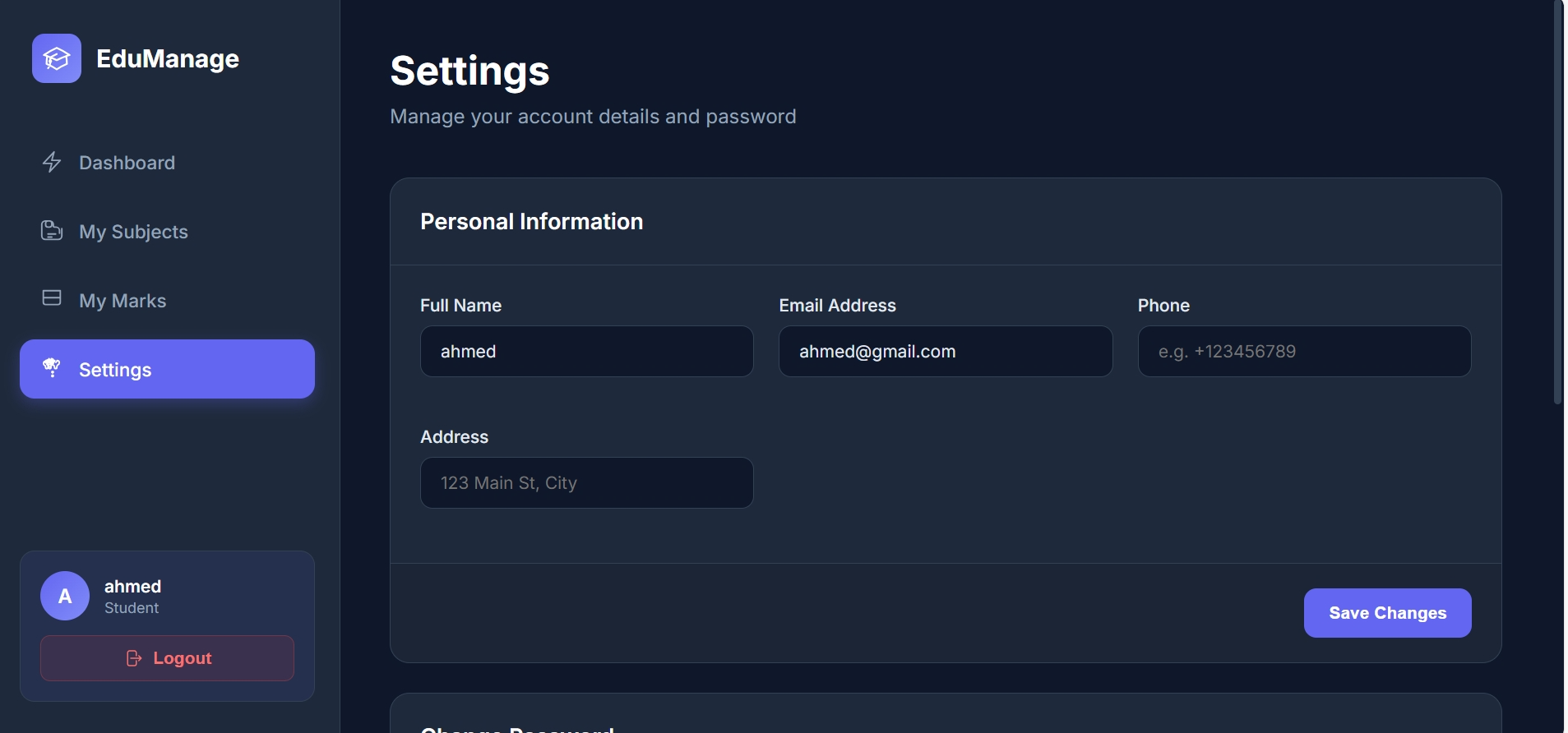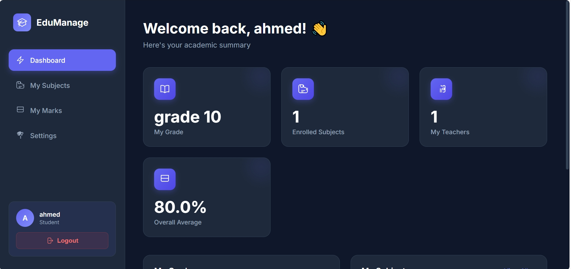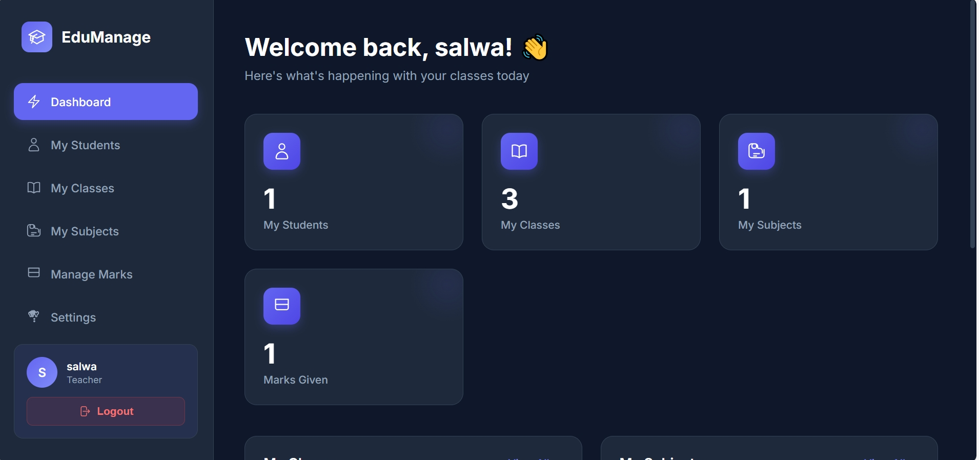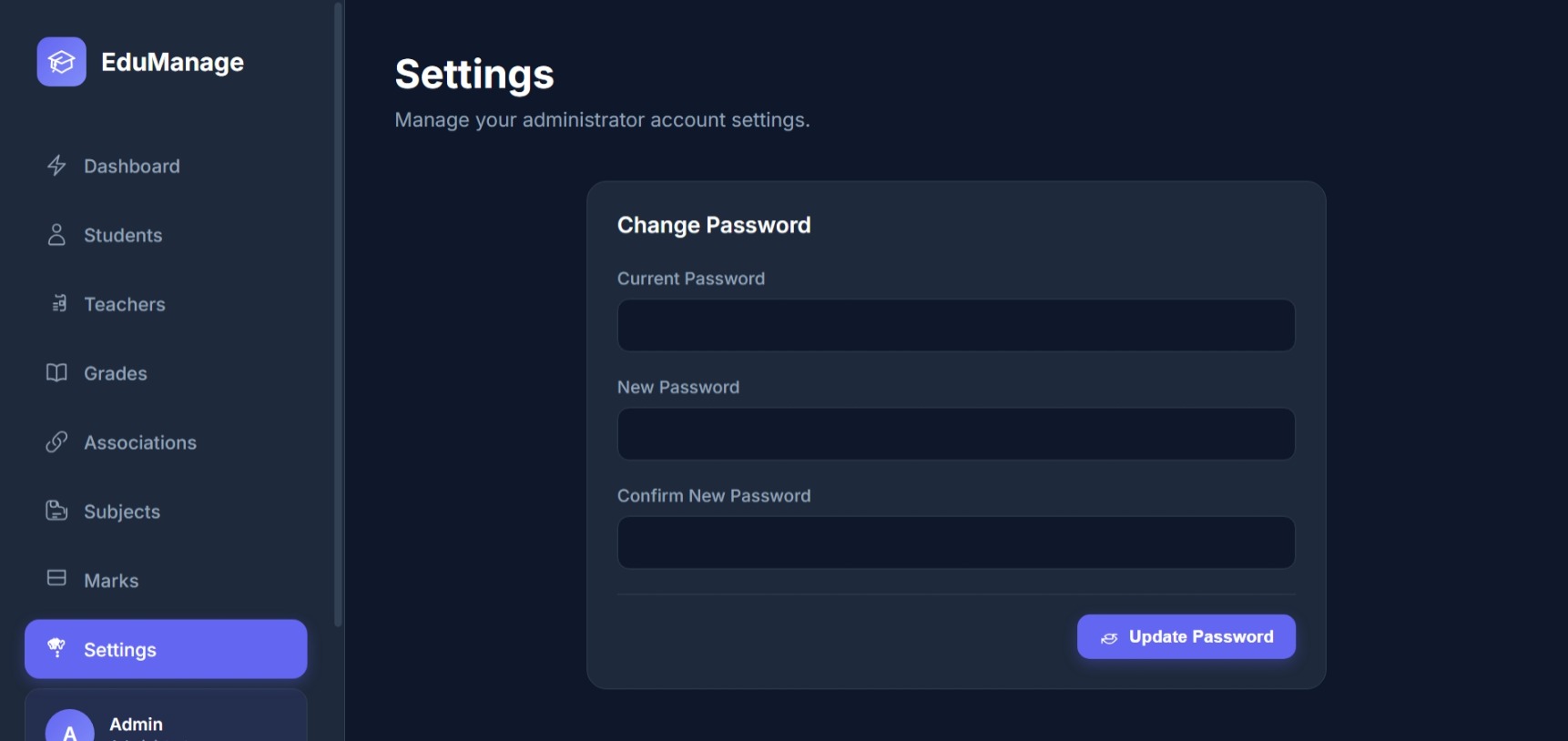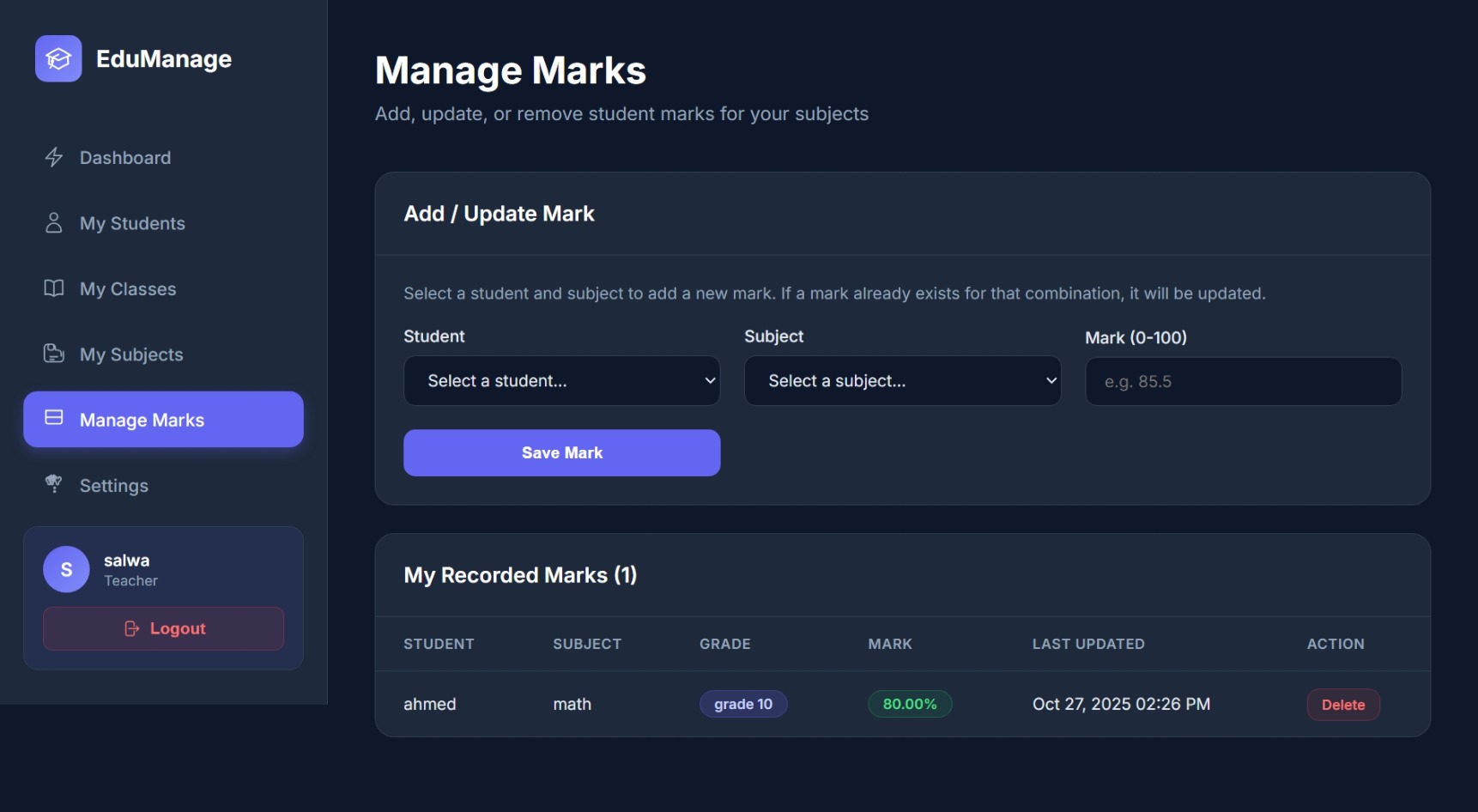 A School Management Web Application that connects administrators, teachers, and students on one platform. It manages student enrollment, class associations, subjects, and grading. Administrators have full control over the system, teachers can add and manage student marks, and students can only view their grades, subjects, and class details — providing a centralized and efficient digital school environment.