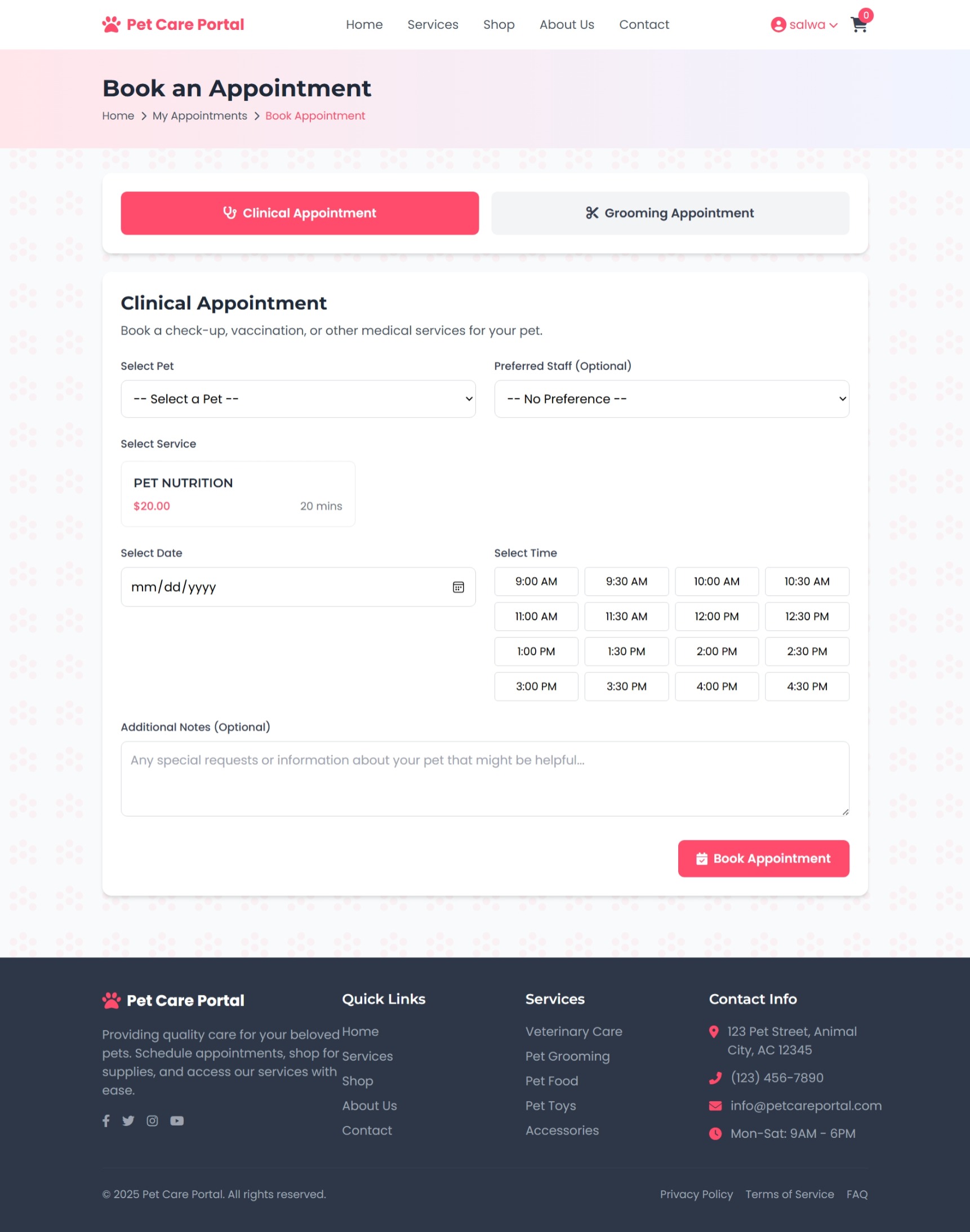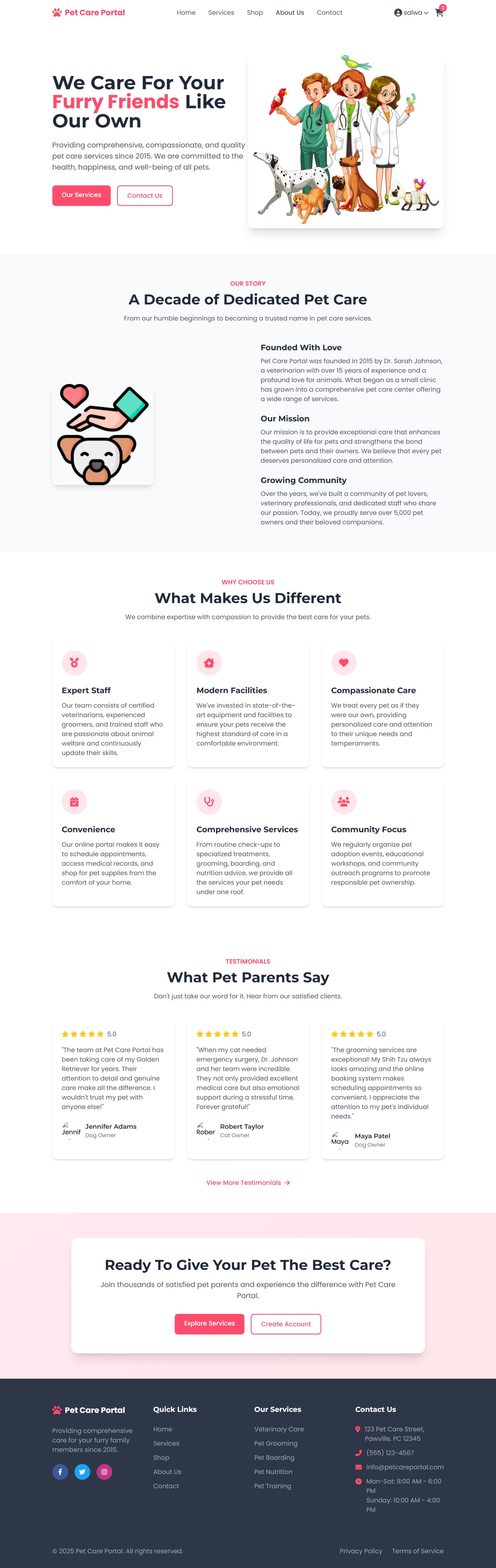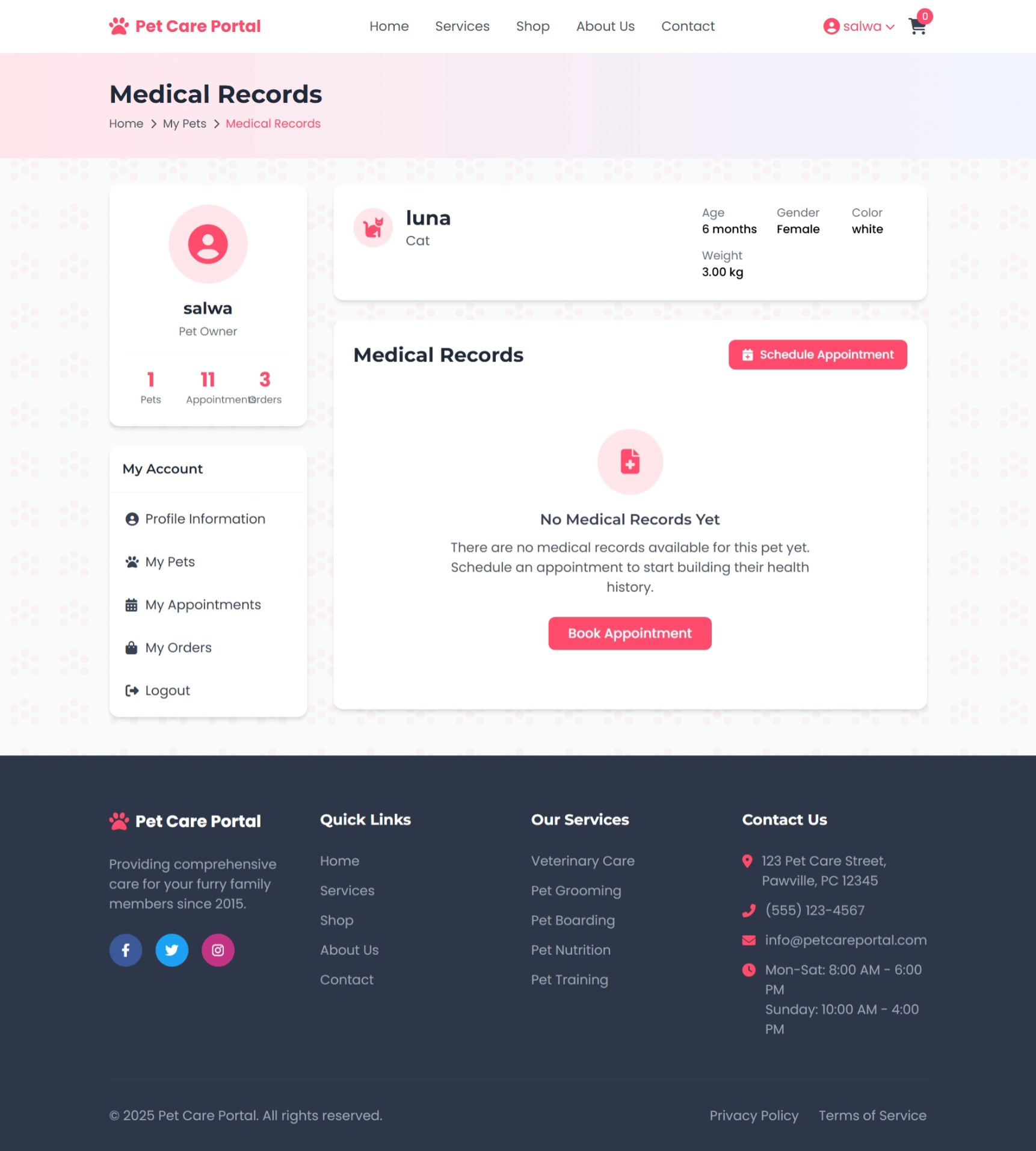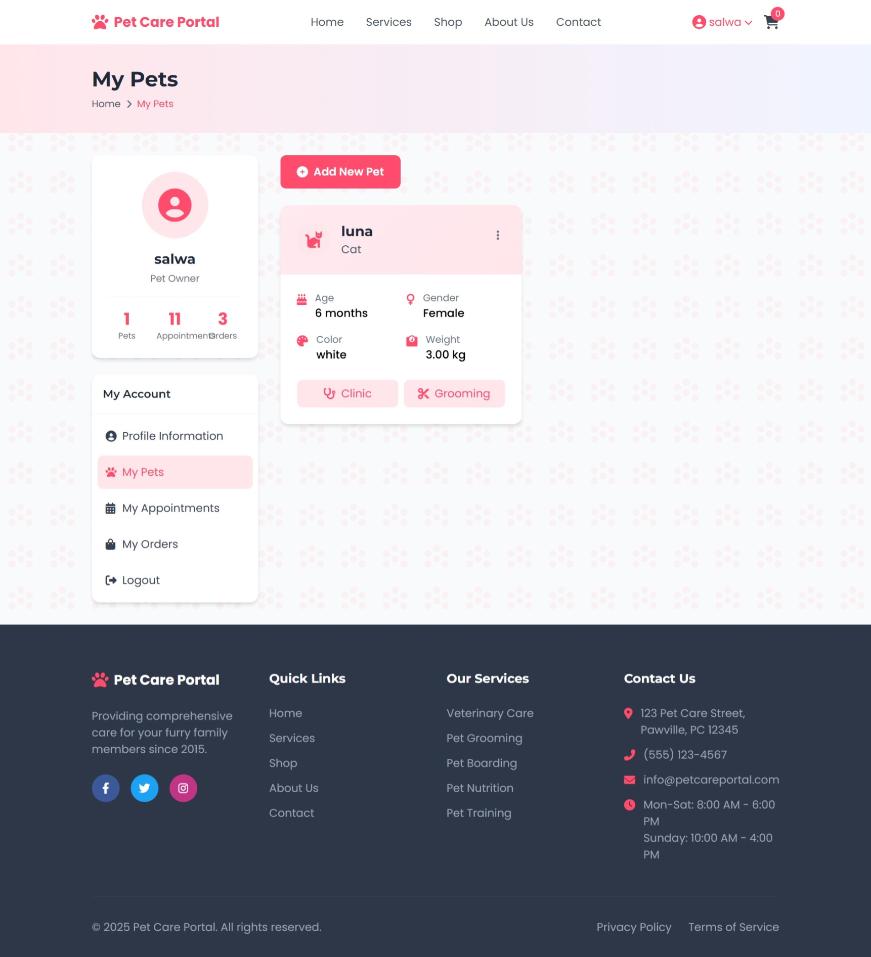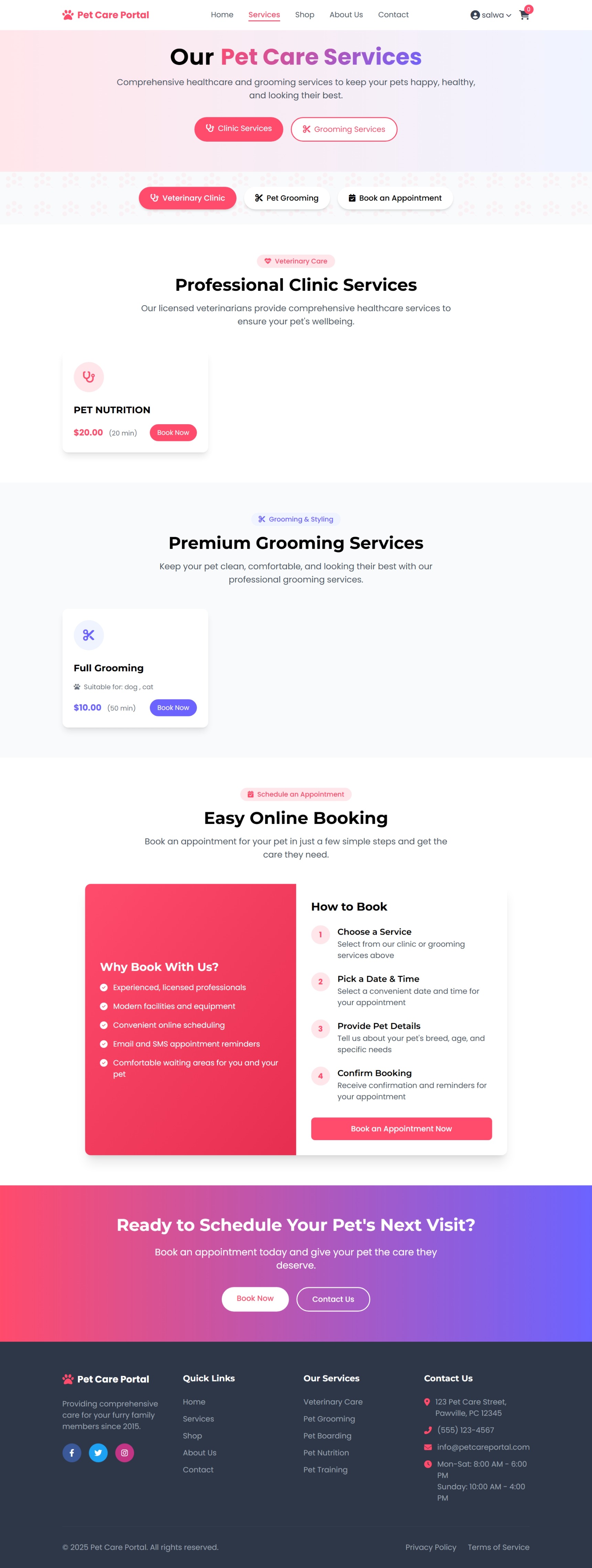A Pet Care Management Web Application that combines online shopping and pet clinic services in one system. It manages users, pets, appointments, medical records, grooming, products, and orders. Pet owners can book vet or grooming sessions, buy pet supplies, and track their pets’ records, while staff handle scheduling, services, and inventory — all from one connected platform.