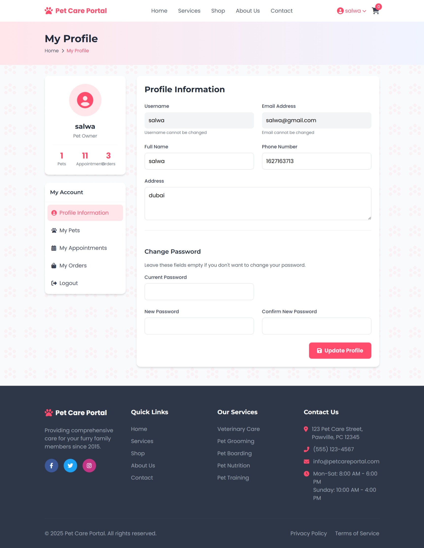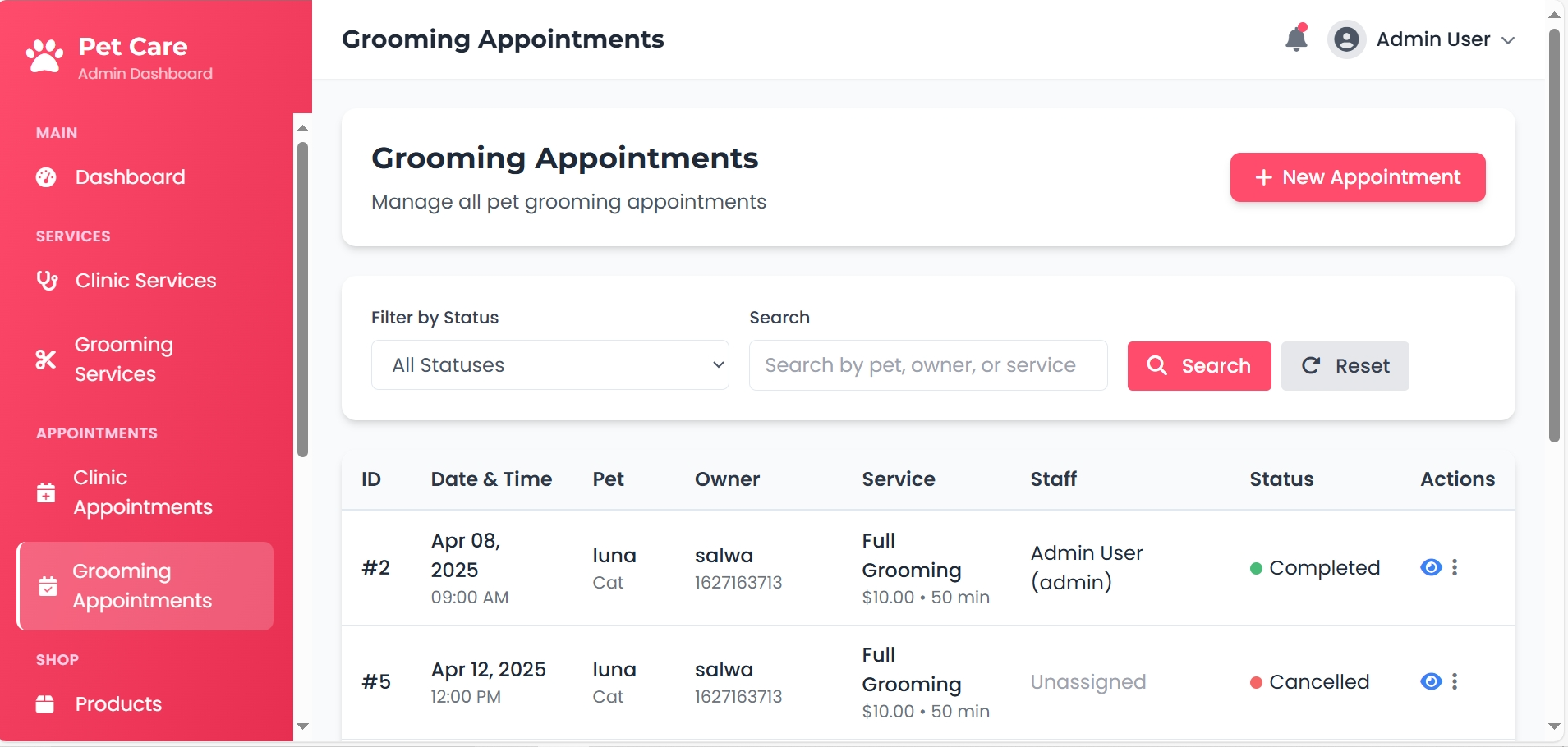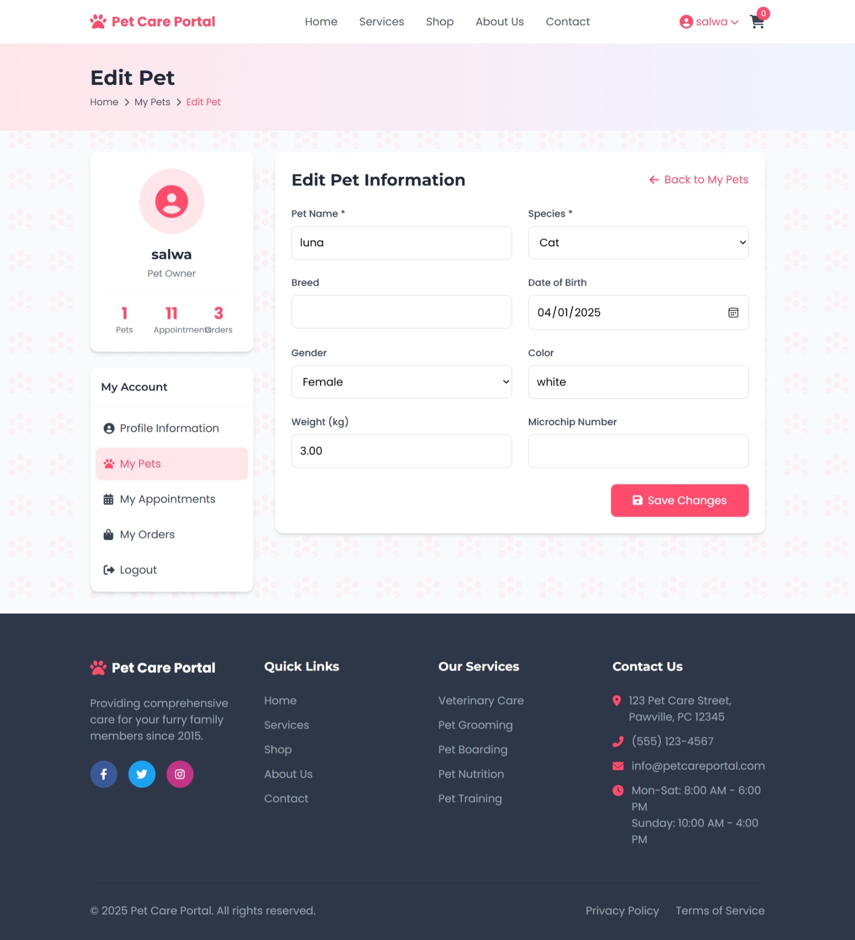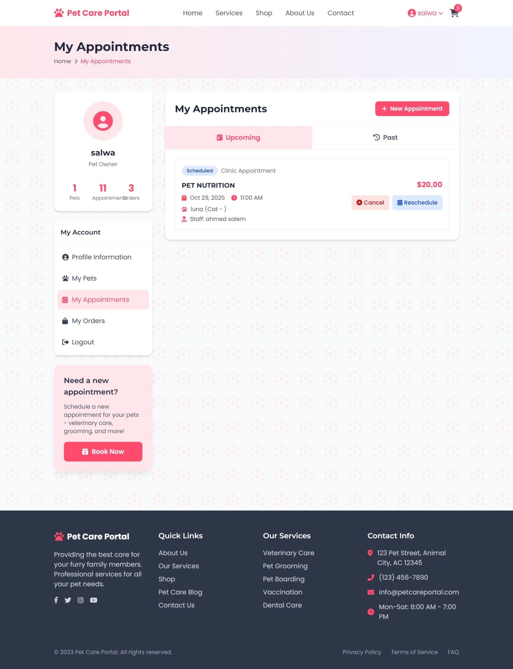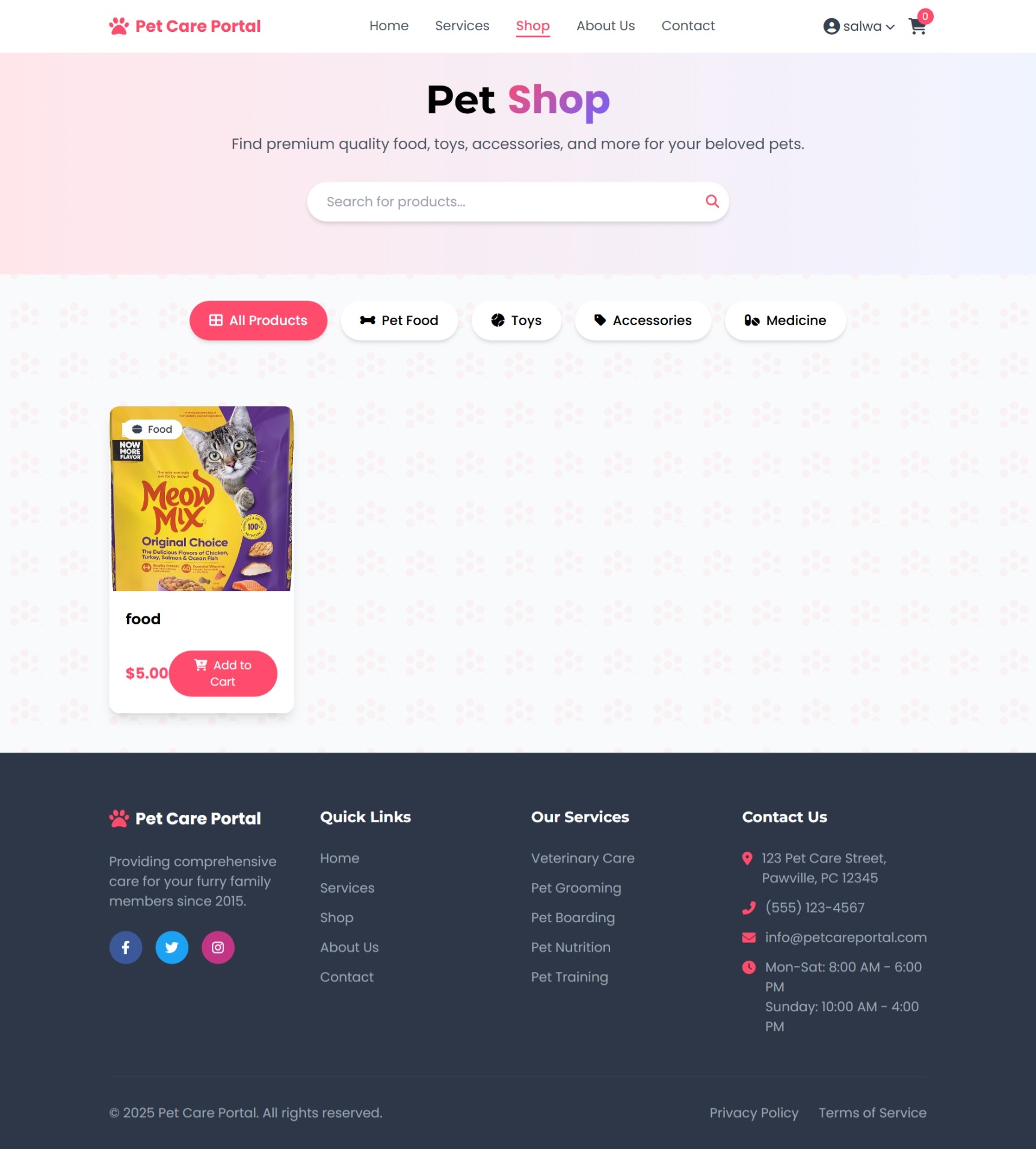 A Pet Care Management Web Application that combines online shopping and pet clinic services in one system. It manages users, pets, appointments, medical records, grooming, products, and orders. Pet owners can book vet or grooming sessions, buy pet supplies, and track their pets’ records, while staff handle scheduling, services, and inventory — all from one connected platform.