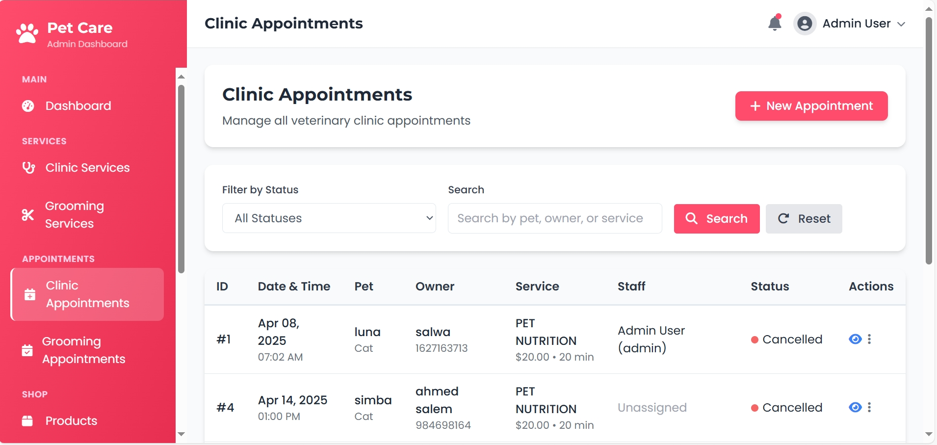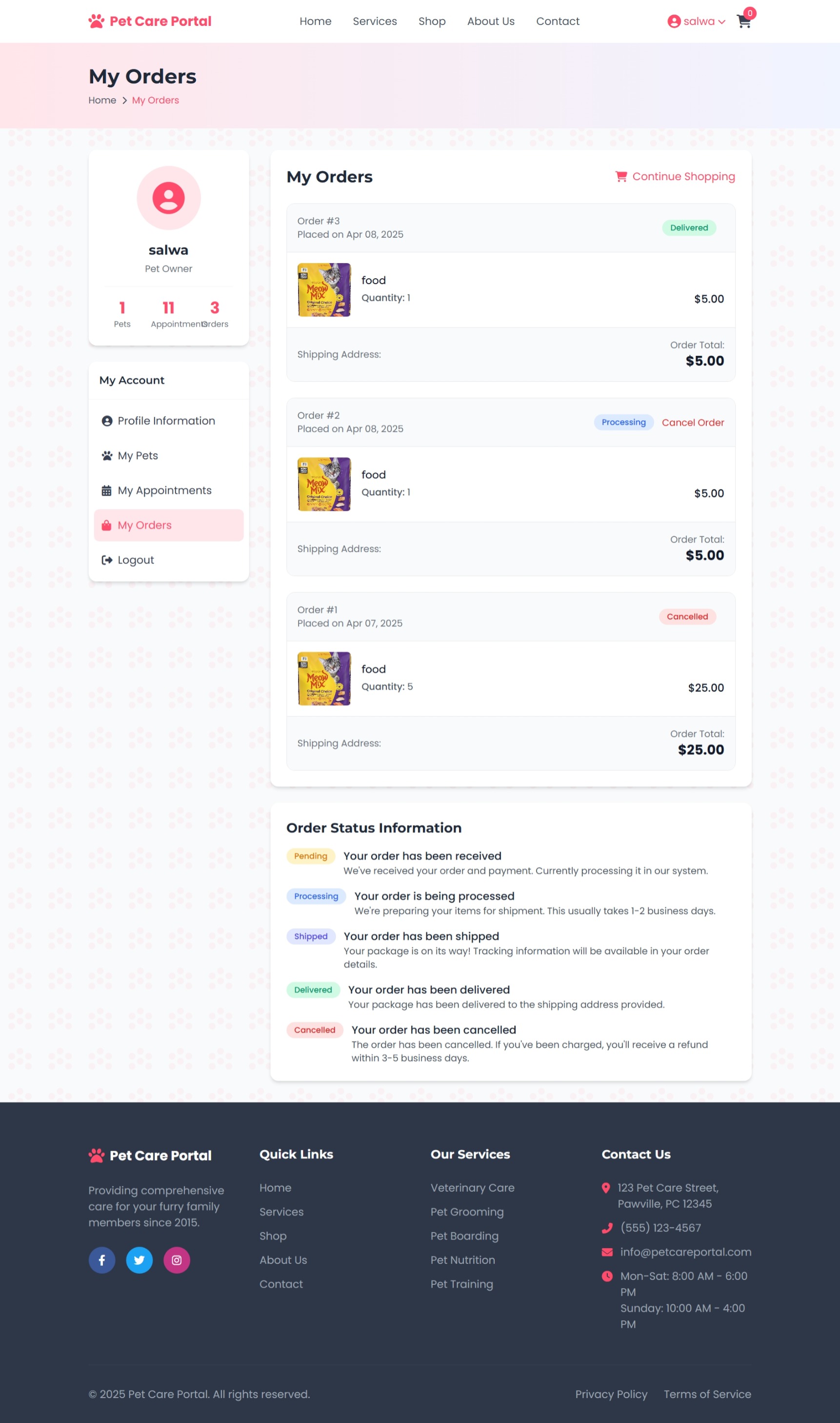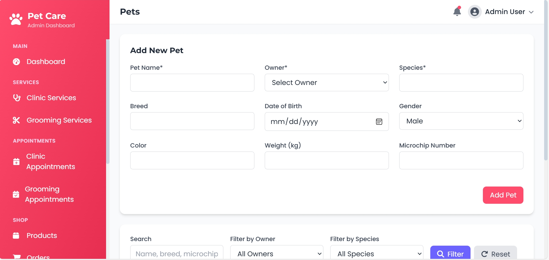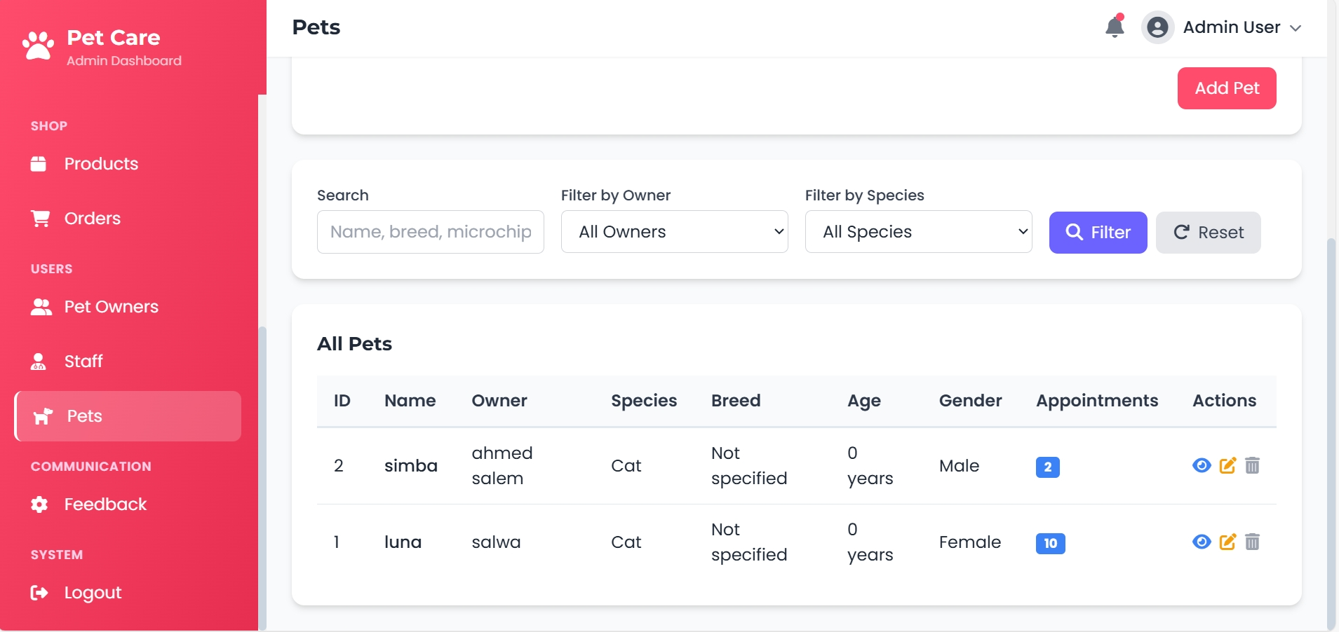 A Pet Care Management Web Application that combines online shopping and pet clinic services in one system. It manages users, pets, appointments, medical records, grooming, products, and orders. Pet owners can book vet or grooming sessions, buy pet supplies, and track their pets’ records, while staff handle scheduling, services, and inventory — all from one connected platform.