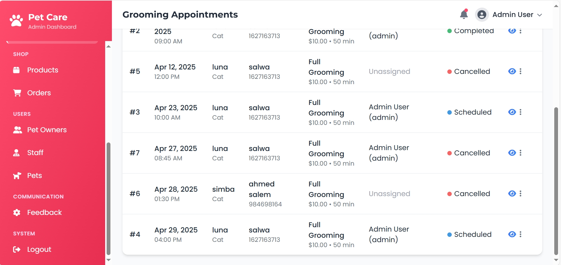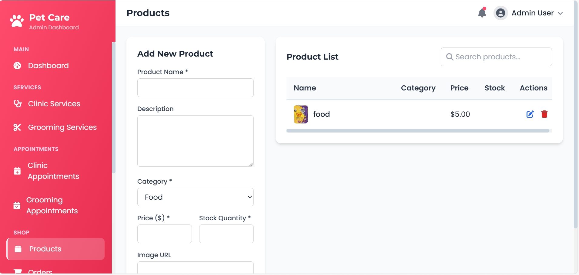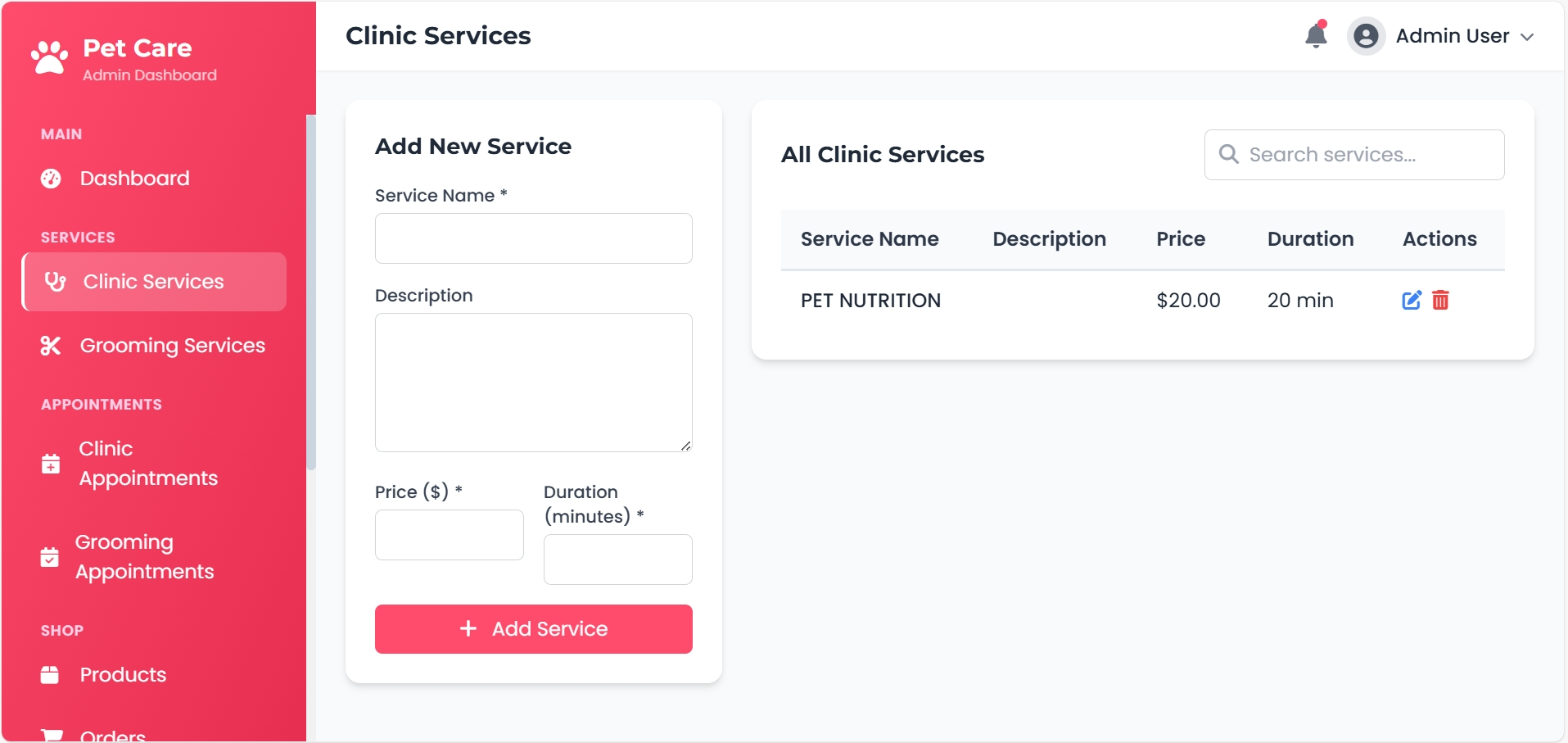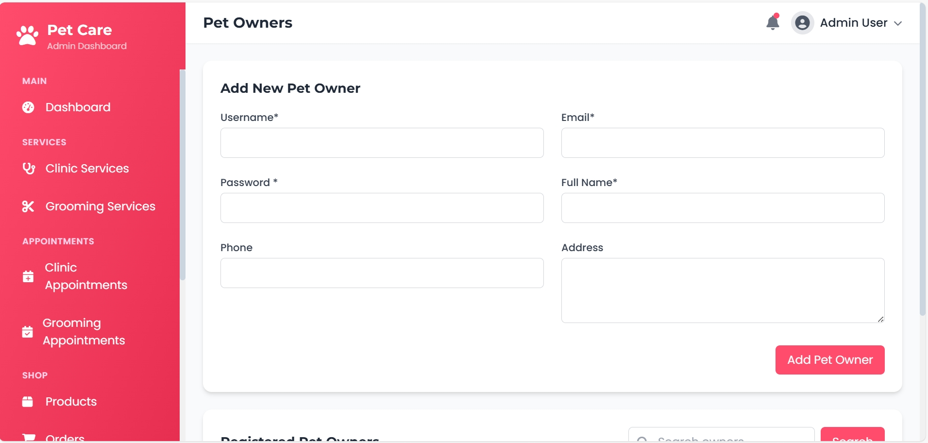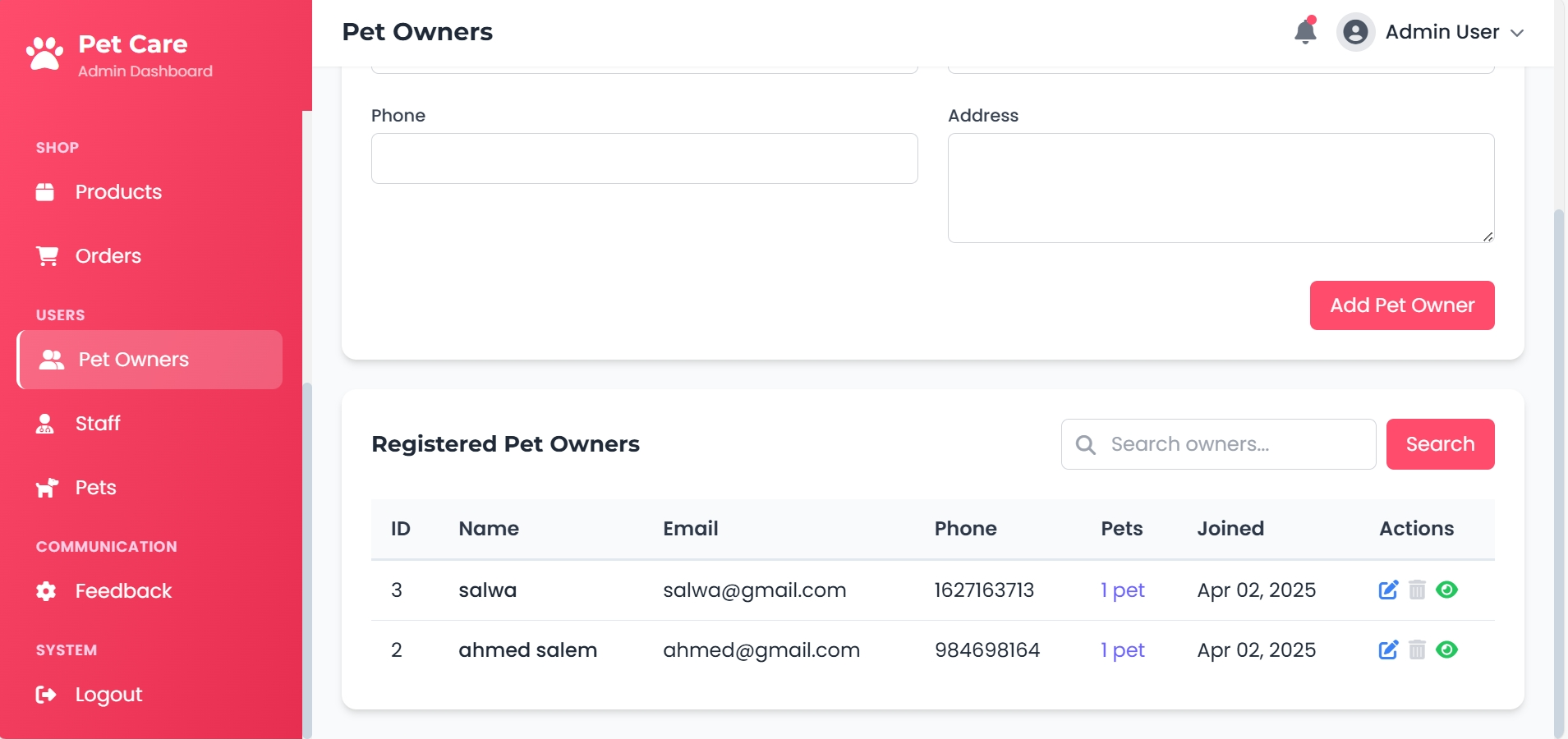 A Pet Care Management Web Application that combines online shopping and pet clinic services in one system. It manages users, pets, appointments, medical records, grooming, products, and orders. Pet owners can book vet or grooming sessions, buy pet supplies, and track their pets’ records, while staff handle scheduling, services, and inventory — all from one connected platform.