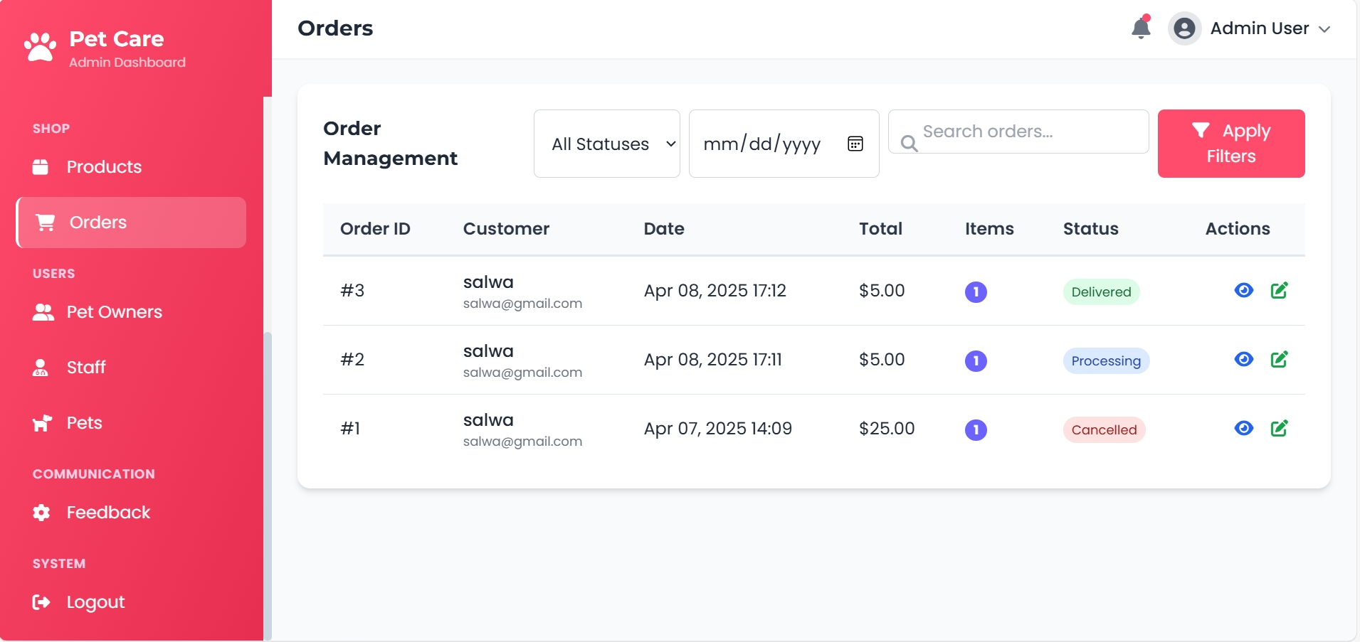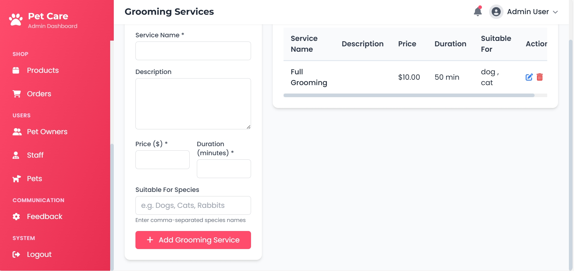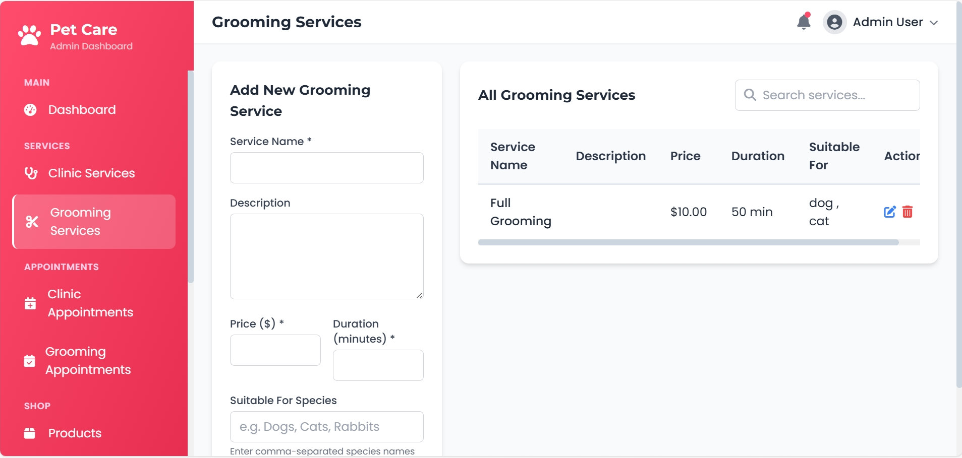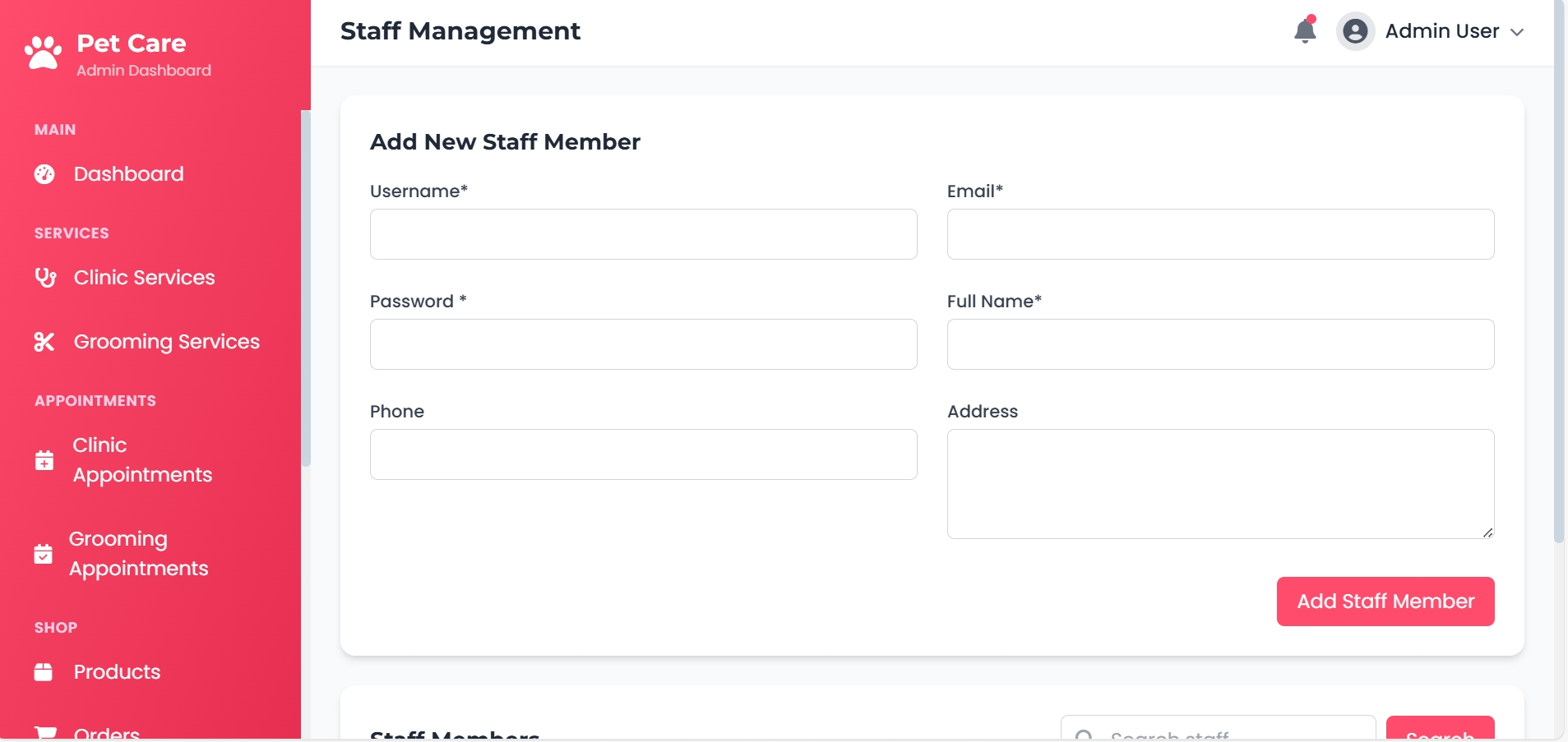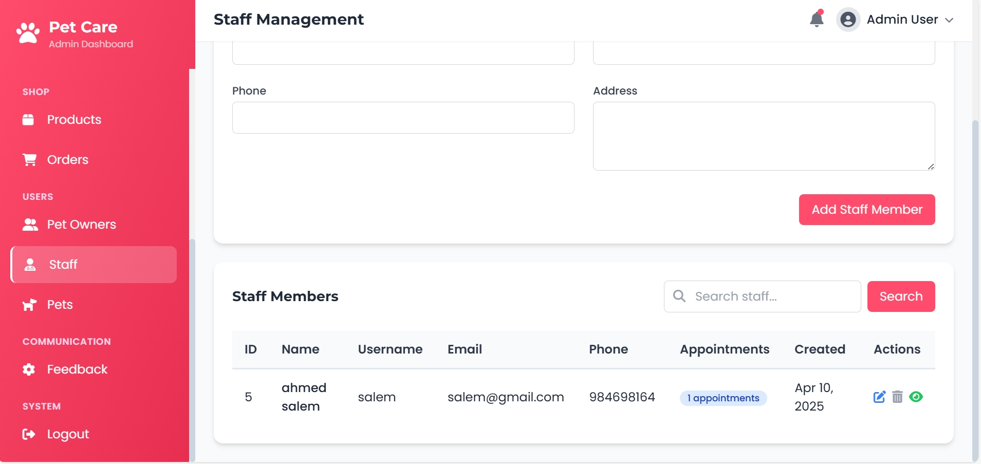 A Pet Care Management Web Application that combines online shopping and pet clinic services in one system. It manages users, pets, appointments, medical records, grooming, products, and orders. Pet owners can book vet or grooming sessions, buy pet supplies, and track their pets’ records, while staff handle scheduling, services, and inventory — all from one connected platform.