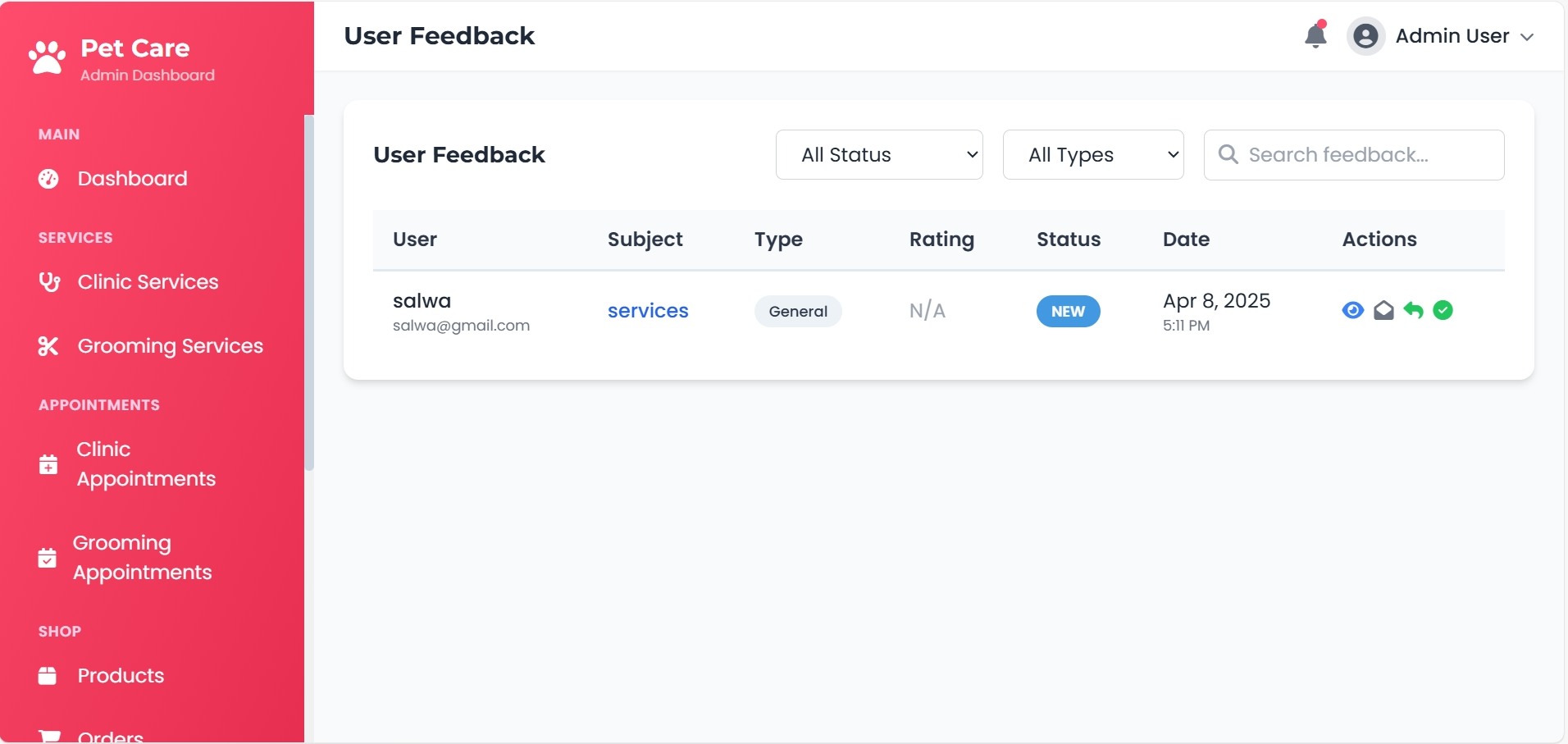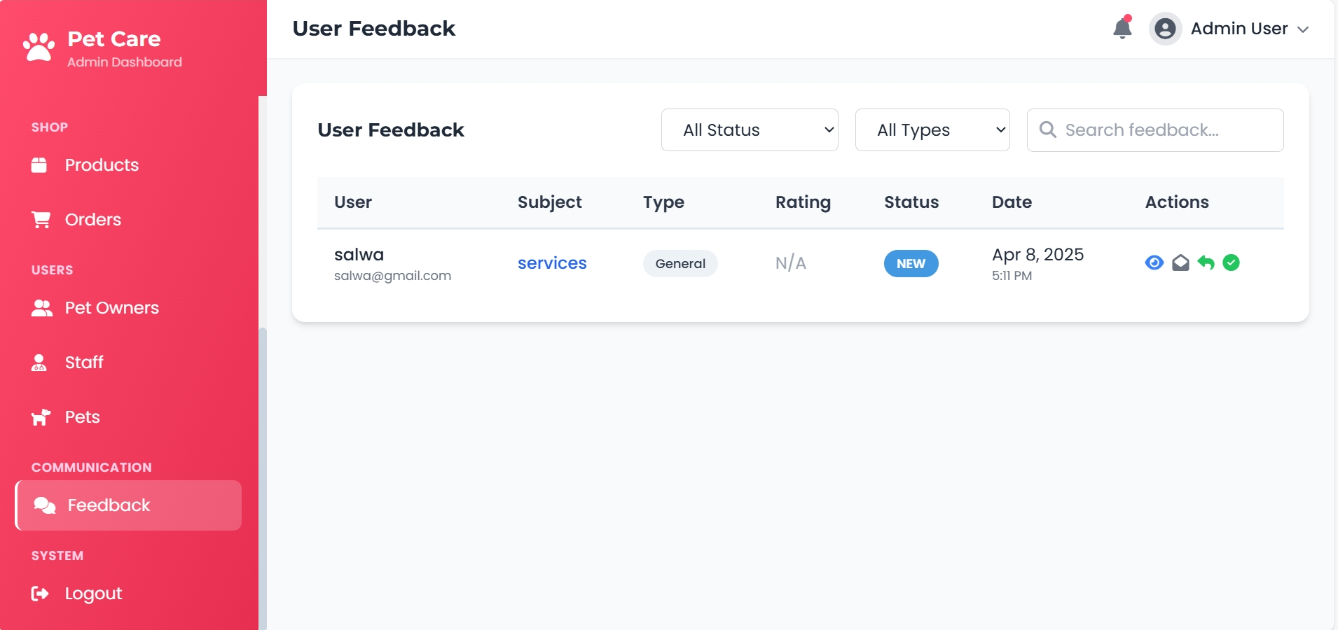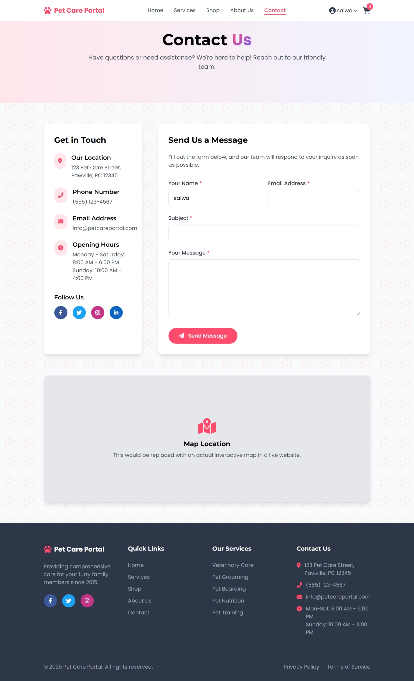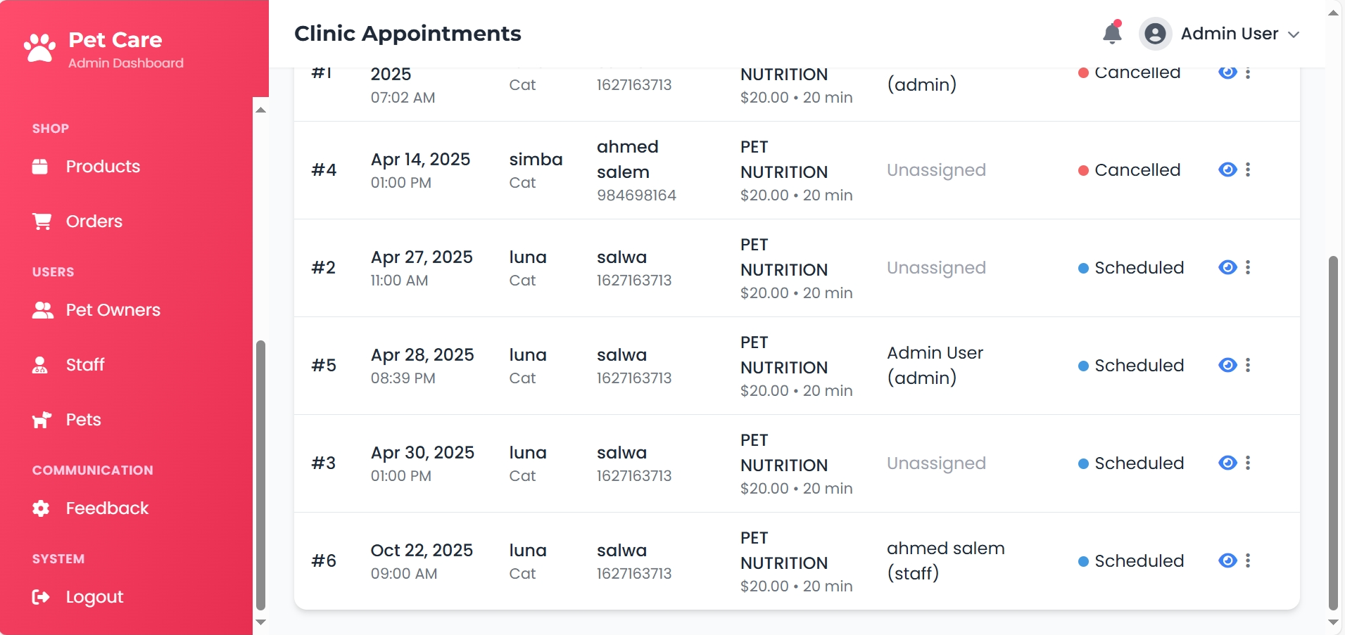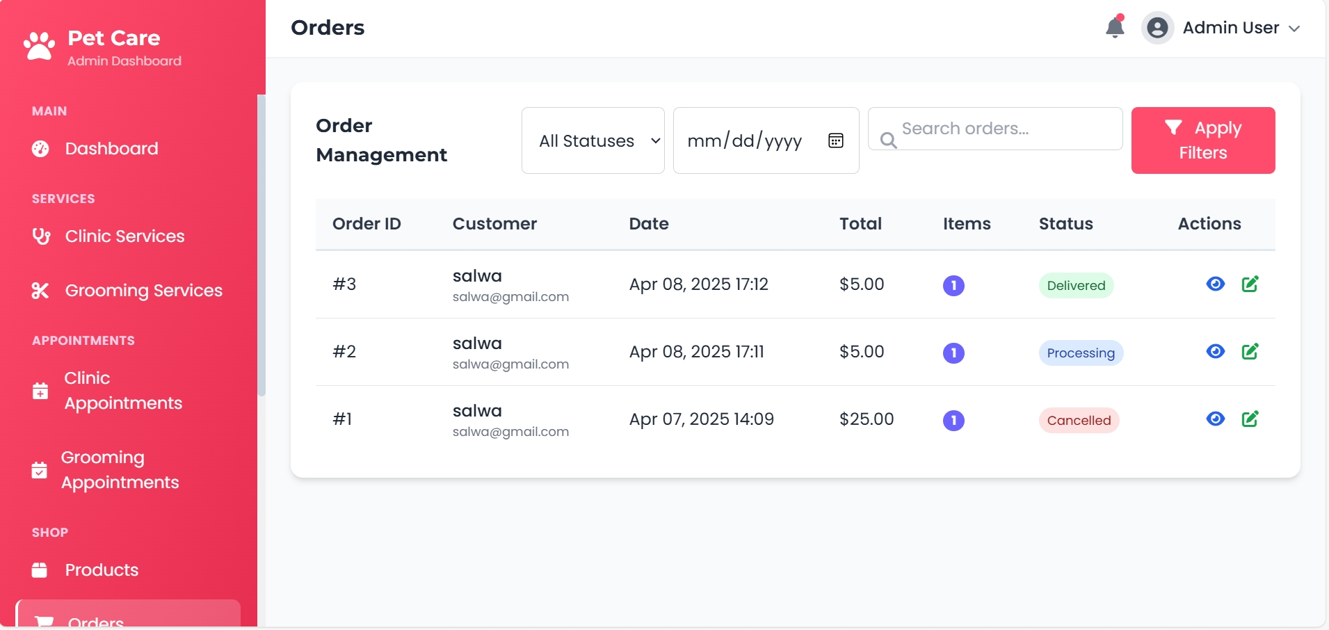 A Pet Care Management Web Application that combines online shopping and pet clinic services in one system. It manages users, pets, appointments, medical records, grooming, products, and orders. Pet owners can book vet or grooming sessions, buy pet supplies, and track their pets’ records, while staff handle scheduling, services, and inventory — all from one connected platform.